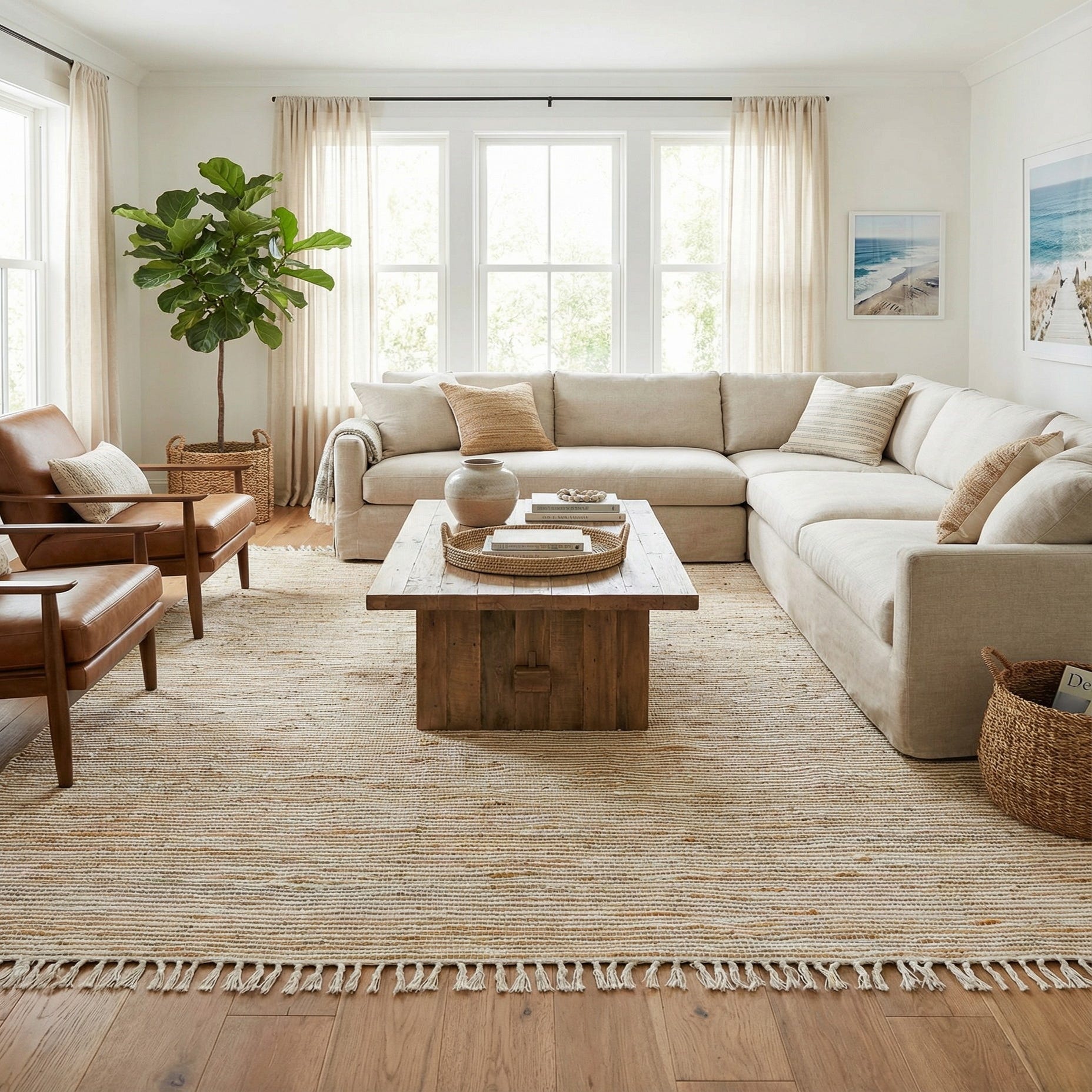 This rug works well in relaxed, layer-forward interiors—place it beneath a low-profile sofa and coffee table in a coastal or modern farmhouse living room, use it to anchor a dining area with light wood furniture, or layer it under a bed to add texture in a minimalist bedroom. Its neutral palette pairs easily with woven accents, rattan seating, and soft linen textiles for a calm, lived-in look.