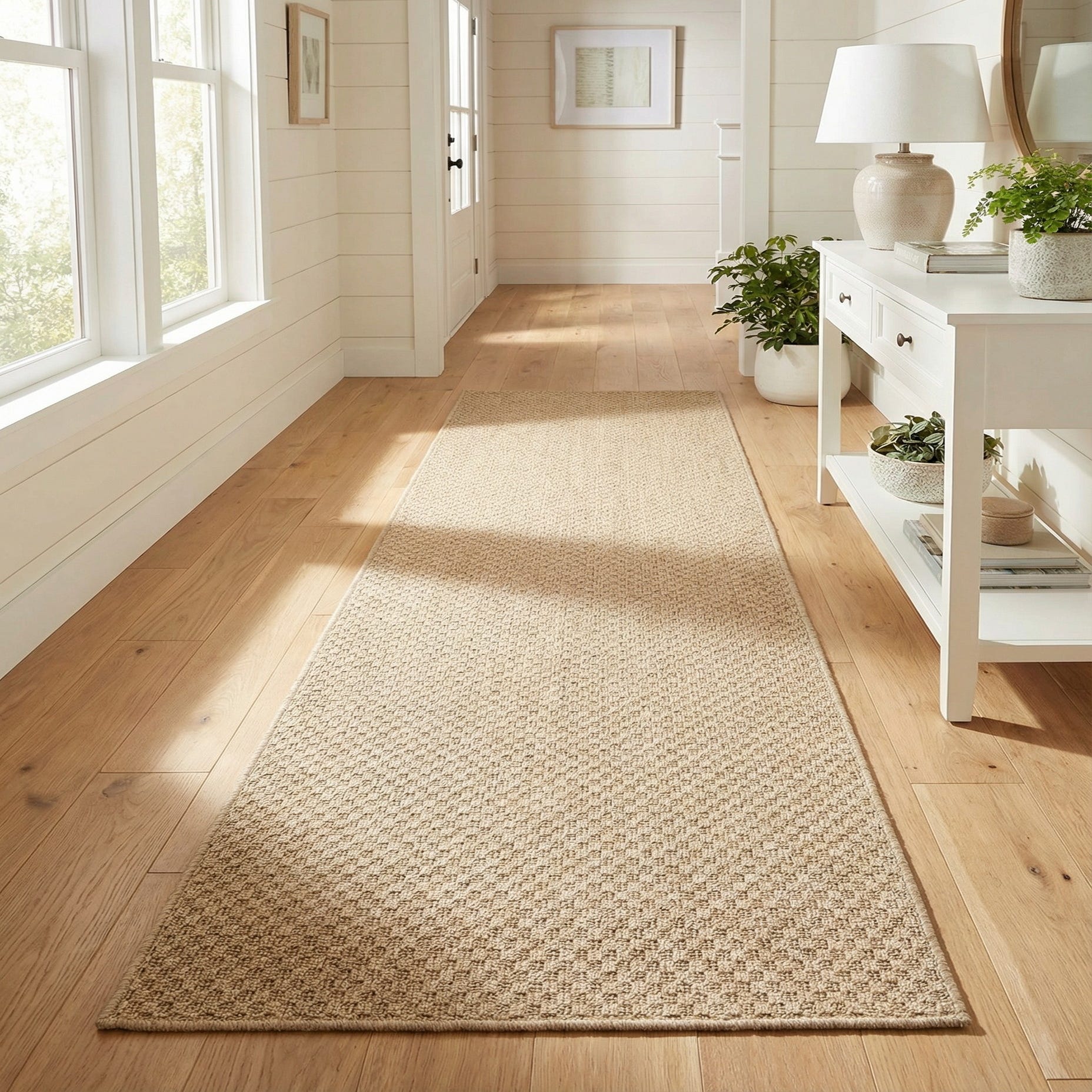 Its neutral hue and understated pattern make it well-suited for hallways, entryways, or corridors, while also being a fitting choice for transitional spaces that bridge different areas of the home. The Dunes runner's simplicity and durability make it a practical yet stylish option for contemporary, minimalist, or coastal themed interiors seeking a grounded and welcoming element.