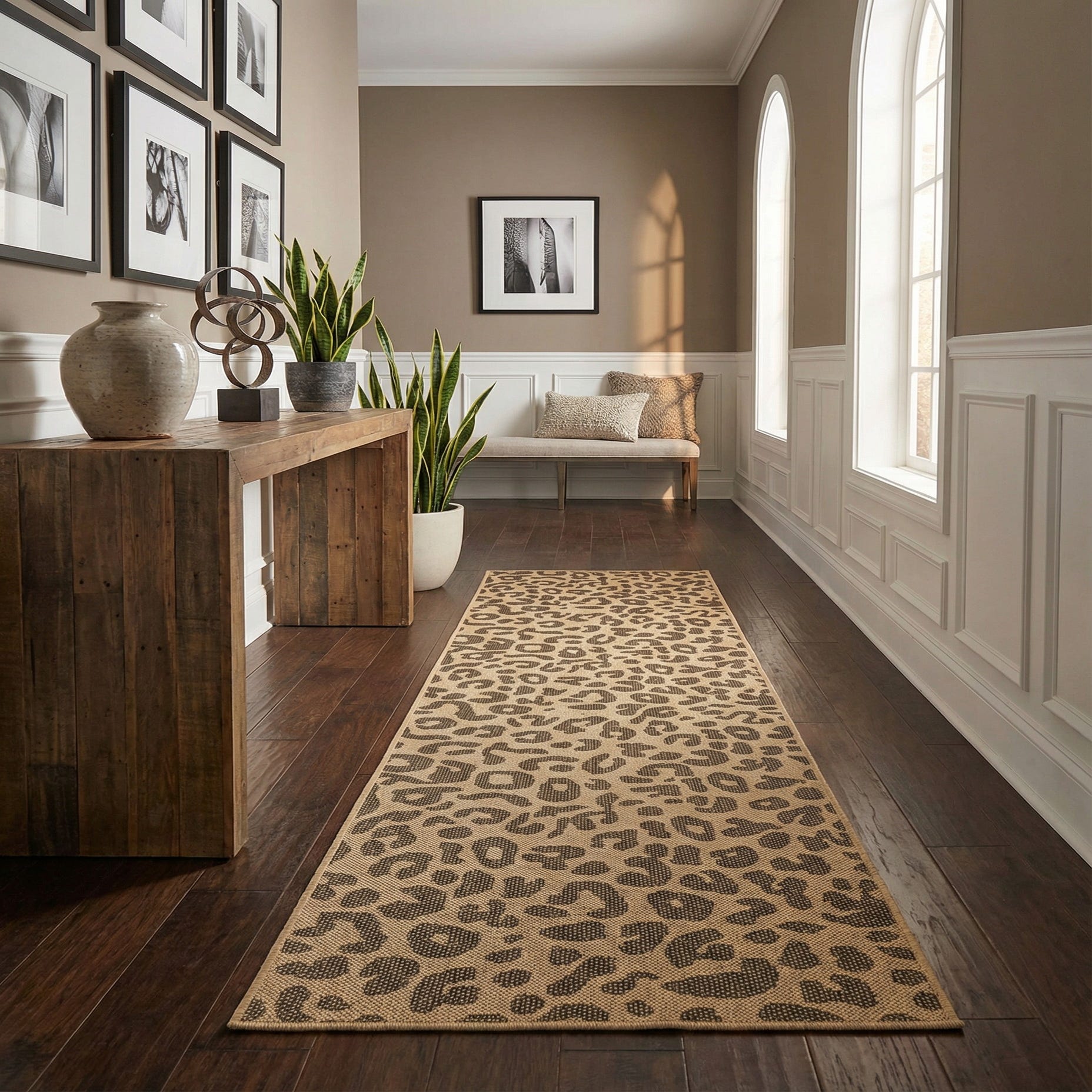 A 12 ft runner rug with a modern abstract leopard print pattern in shades of brown and tan, suitable for a hallway.