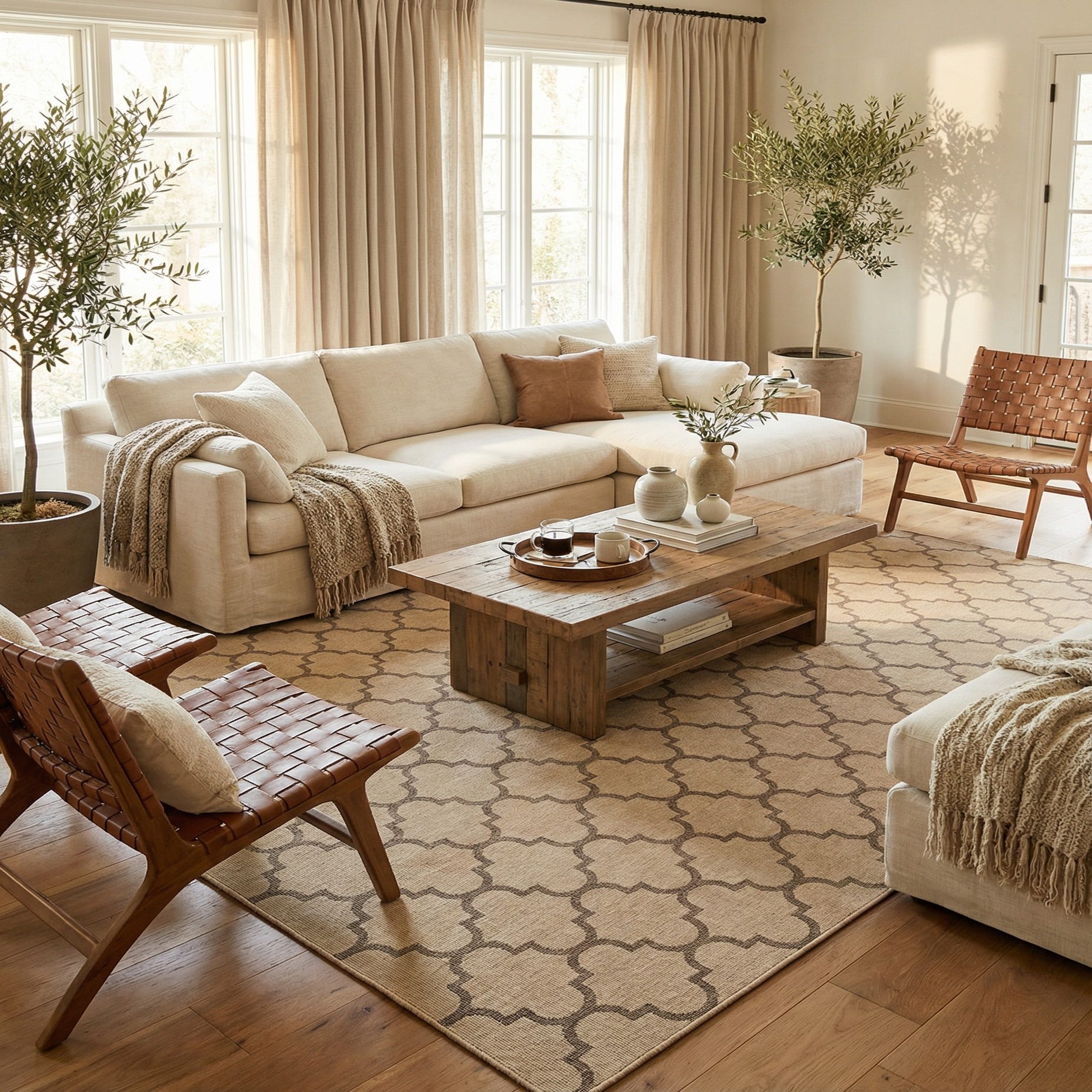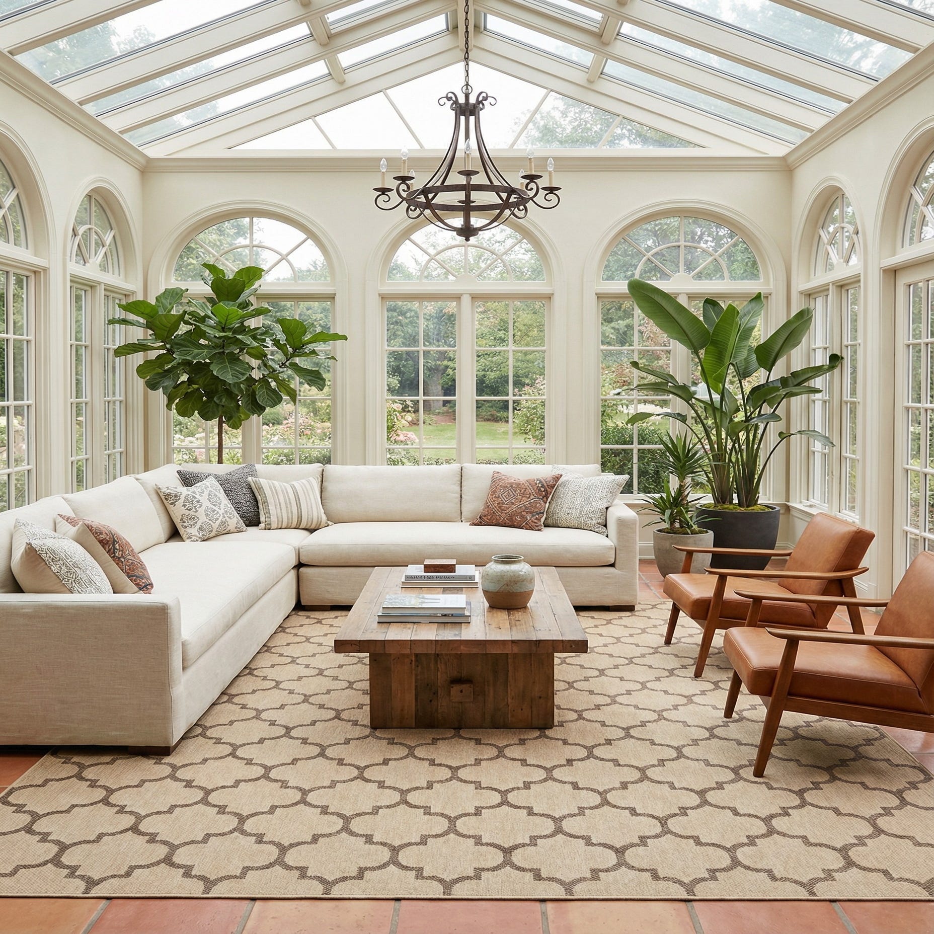 This rug works well as an anchor for a casual living room seating area, under a wood or glass dining table, or layered in a muted, transitional bedroom. Its neutral natural and brown palette pairs easily with light woods, leather furniture, or cool metal accents, and the geometric pattern complements both modern and traditional furnishings. The look suits entryways, family rooms, or sunlit enclosed porches where a dependable, easygoing foundation is needed.