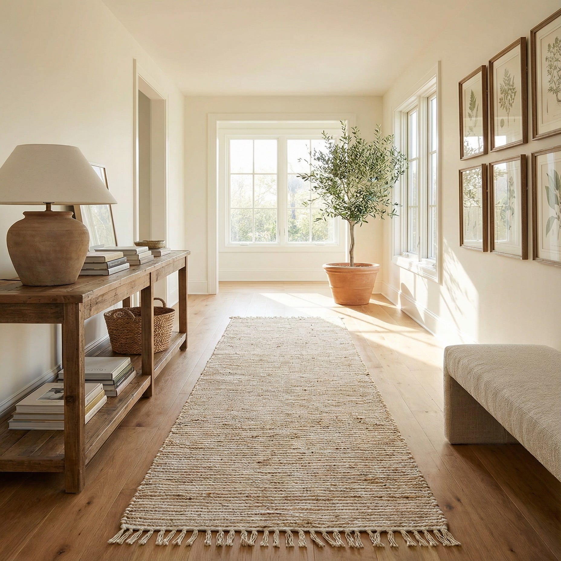 Use this runner to anchor a long hallway, line a galley kitchen, or add grounding texture to an entryway. It complements light oak or white-washed floors, linen upholstery, and woven or rattan accents, and suits styles ranging from modern farmhouse and Scandinavian minimalism to relaxed coastal or bohemian interiors. Layer it over a larger neutral area rug or place it beneath a narrow console to introduce warmth and a hand-crafted feel.