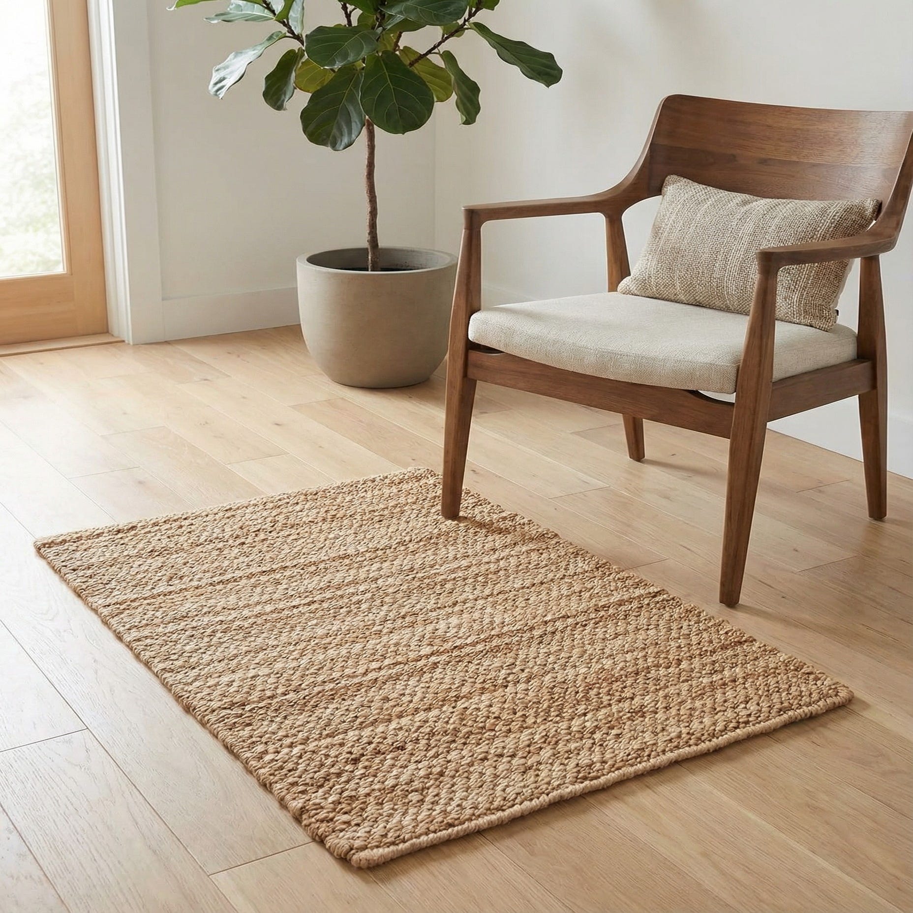 This piece pairs naturally with wood furniture, rattan accents, linen upholstery, and leather, and complements interiors leaning toward coastal, Scandinavian, modern farmhouse, or casual contemporary styles. Use it to anchor a small seating area, place it at the foot of a bed, or layer it over a larger neutral rug for depth and texture—anywhere you want an earthy, lived-in feel and natural material presence.