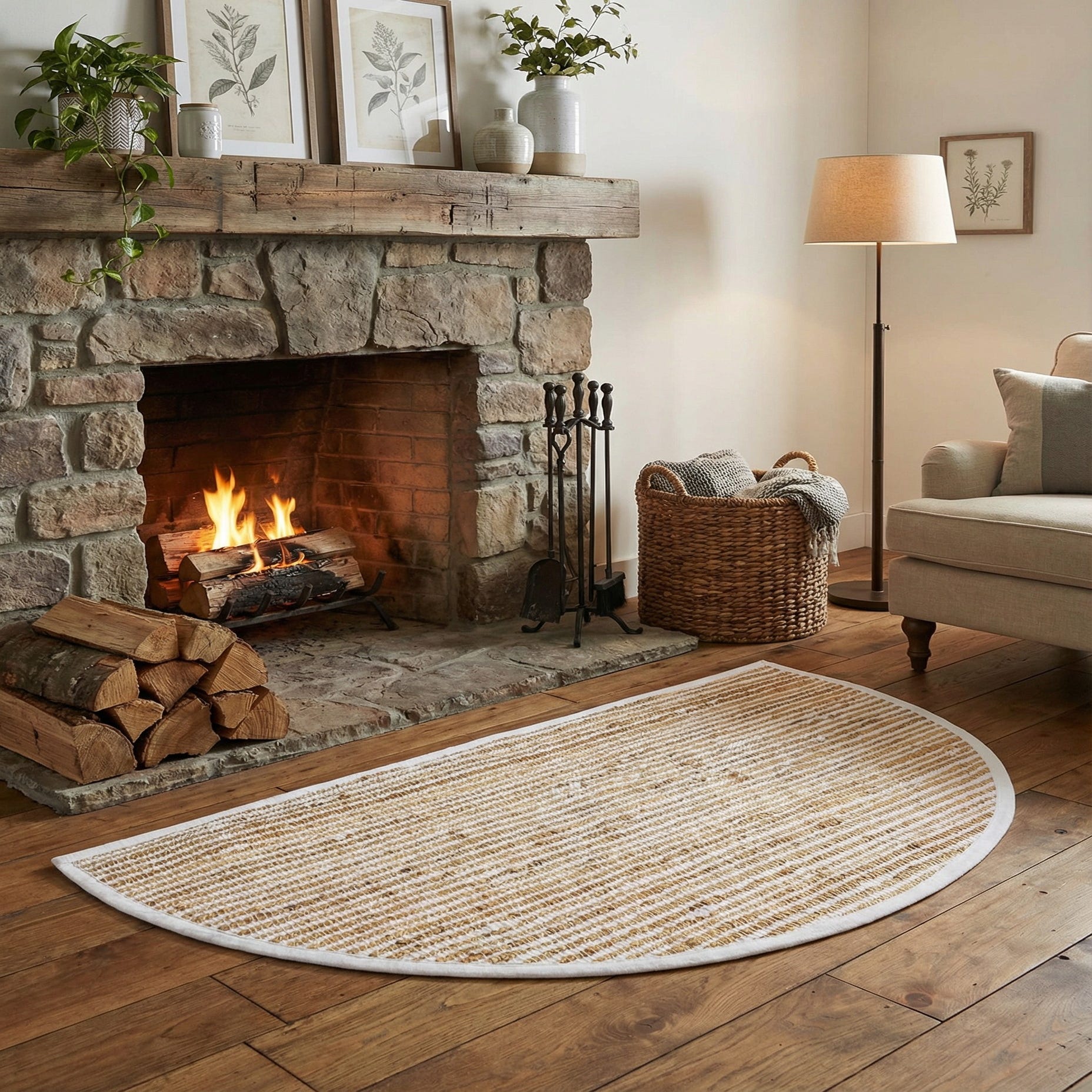 A half-round hearth rug with narrow horizontal ivory stripes set against a natural jute background, this hand?woven piece balances simple pattern with tactile interest. The 60% cotton and 40% jute construction creates a low?profile, slightly slubby surface: soft cotton threads sit alongside textured jute for a contrast you can both see and feel. A clean white binding frames the shape, keeping the look crisp and tailored.