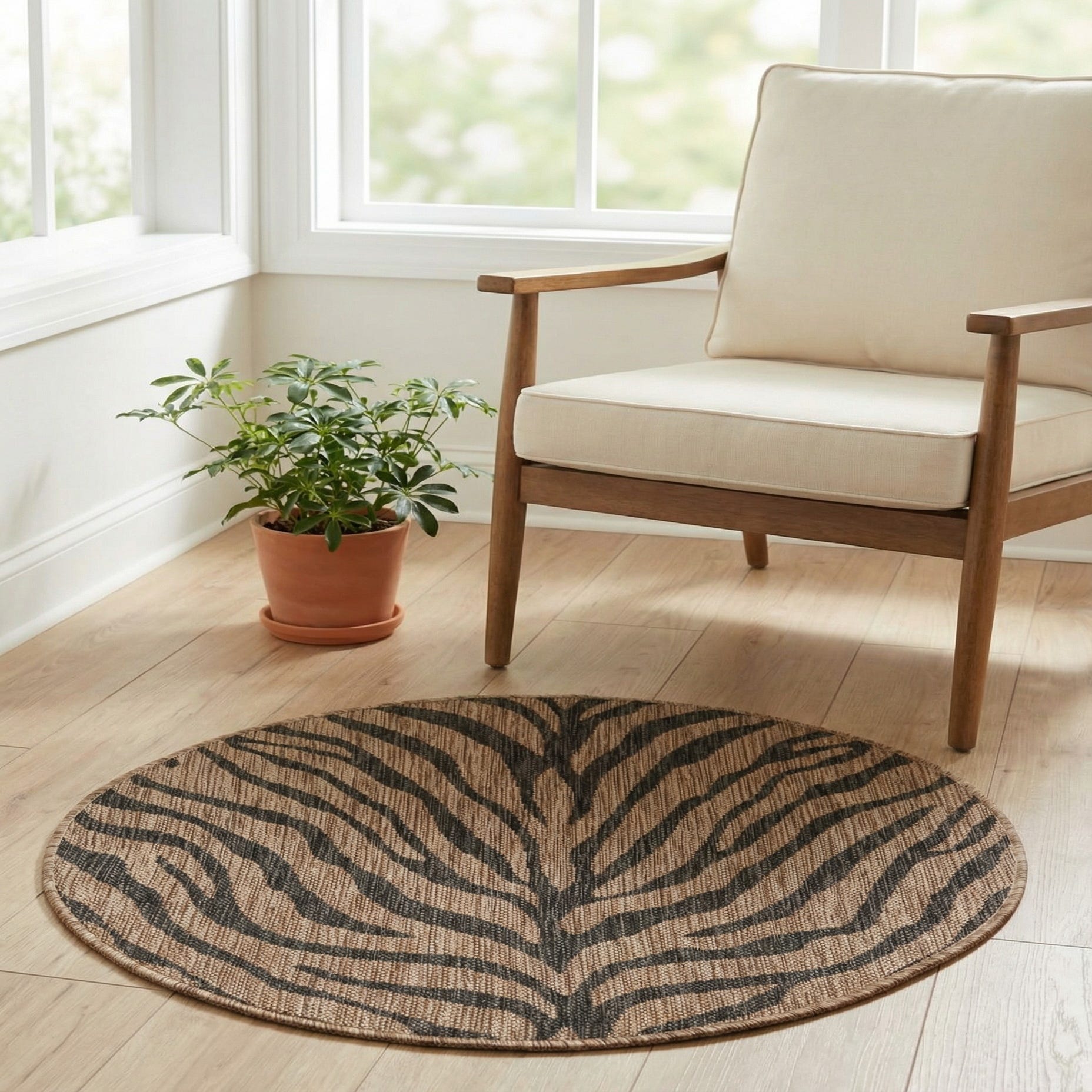 This Outdoor Safari Collection rug is a 3 Ft Round piece that embodies versatility and durability. Machine woven of 100% polypropylene makes this selection both stain-resistant and easy to clean. The flatweave construction contributes to its practicality, making it a suitable option for high-traffic areas and an ideal choice for pet-friendly homes.