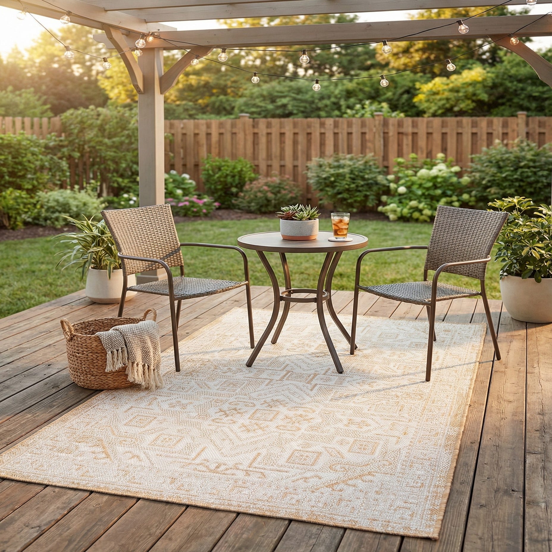 Machine-made of 100% polypropylene, this rug offers a clean, neutral foundation for many design directions. It works well on a covered patio or sunroom, in an entryway or kitchen, or layered beneath a small seating nook. Pair it with rattan or wicker furniture, linen upholstery and light wood finishes for a coastal or modern farmhouse look, or use it to soften a minimalist or bohemian scheme with natural accents and greenery.