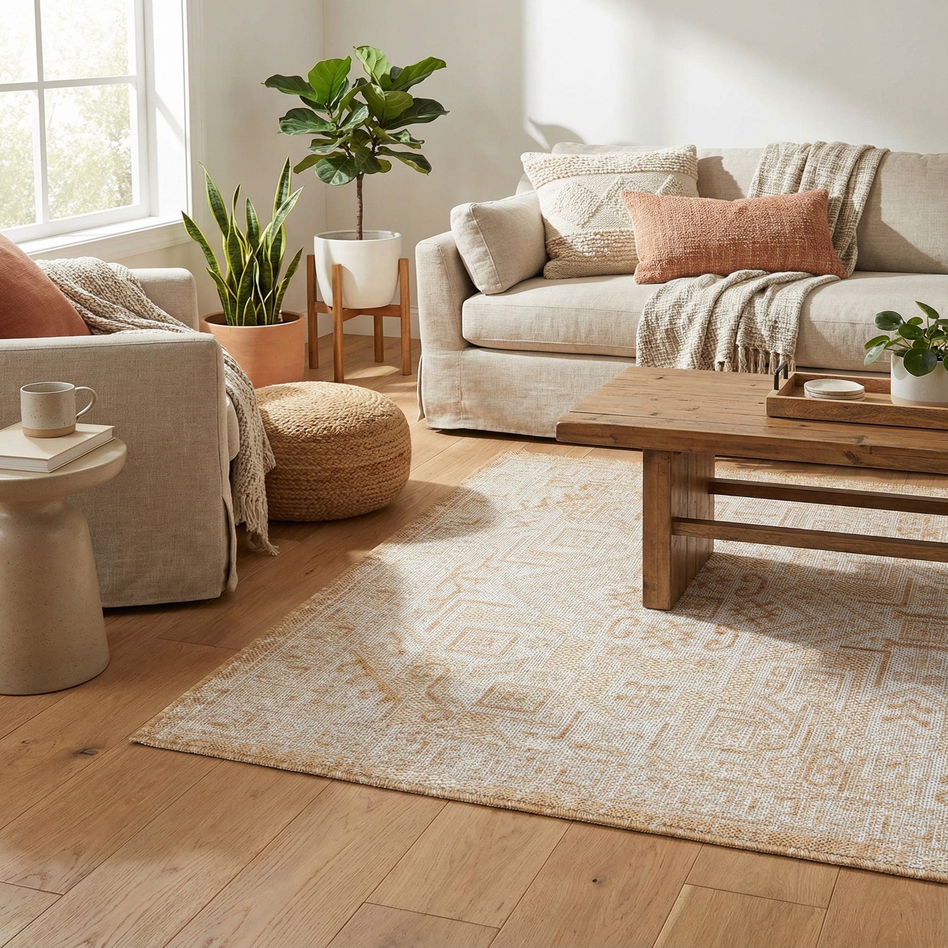 A low-contrast Aztec medallion pattern unfolds across a soft natural background, worked in warm beige tones that create a layered, textural look. The geometric design balances squares, chevrons and small stylized motifs for a refined, vintage-inspired feel that complements rather than competes with surrounding décor. The surface is low-profile and tightly woven, with a firm, slightly textured hand that you can feel underfoot.