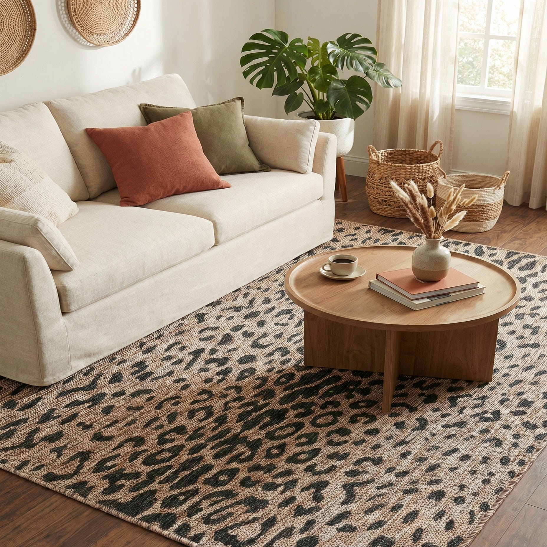 An animal-inspired, all-over spotted pattern gives this rug a confident yet approachable look. The Natural background provides a warm, neutral base while flecks of Black, Gray, and Light Brown form varied, irregular spots that create visual movement across the surface. Machine made from 100% polypropylene, the weave is low-profile and tightly constructed so the texture feels slightly firm underfoot with a subtle, tactile grain from the woven fibers.