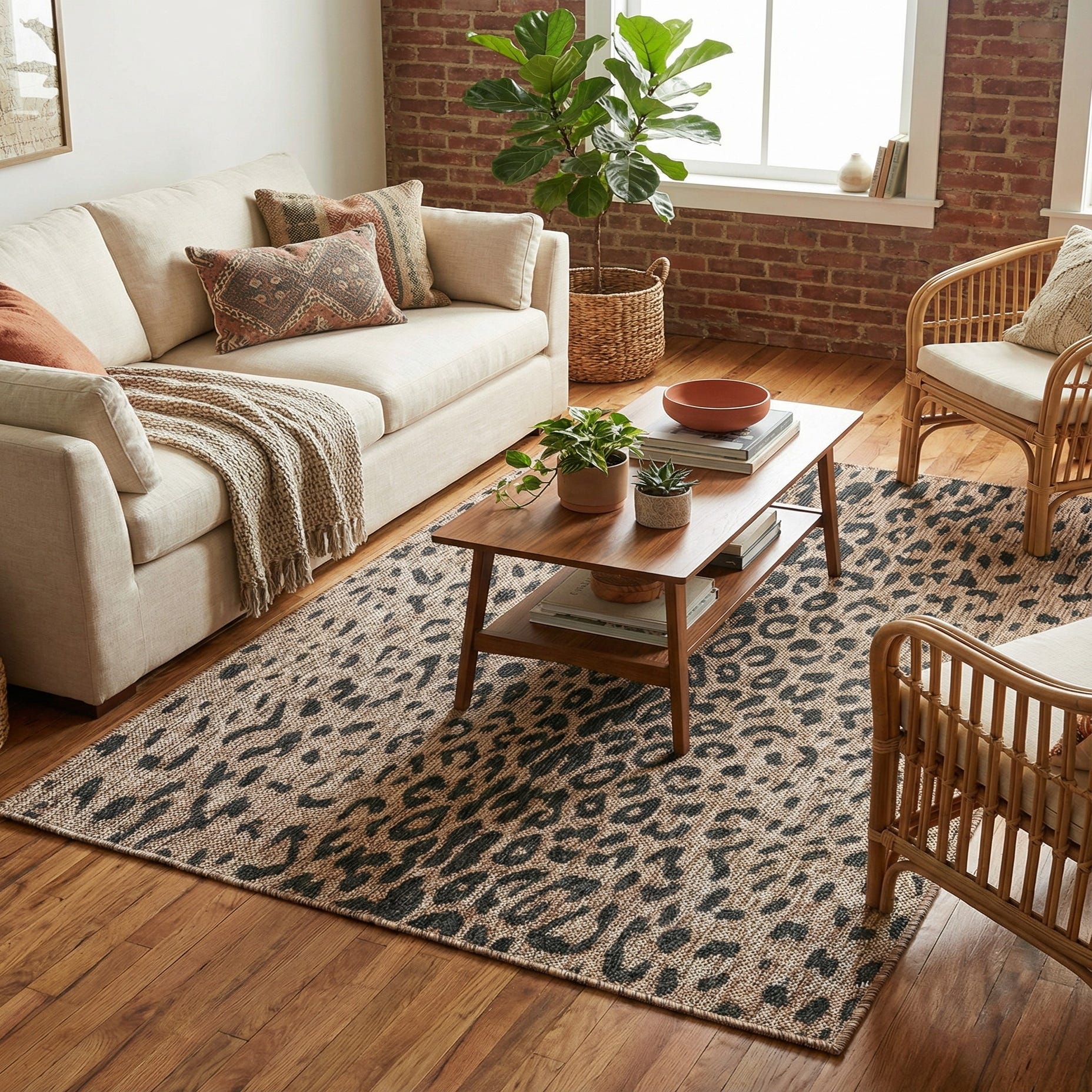 A 3x5 rectangular indoor/outdoor rug featuring a modern leopard print in shades of brown, tan, and black, with a flatweave texture.