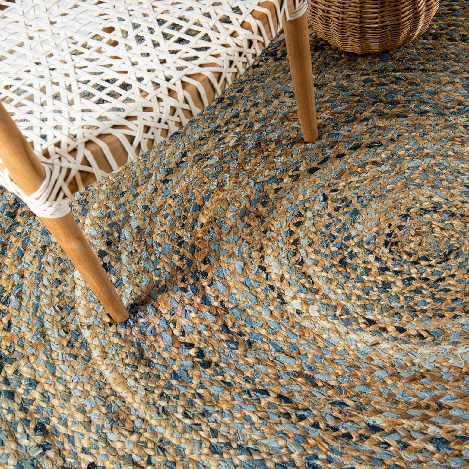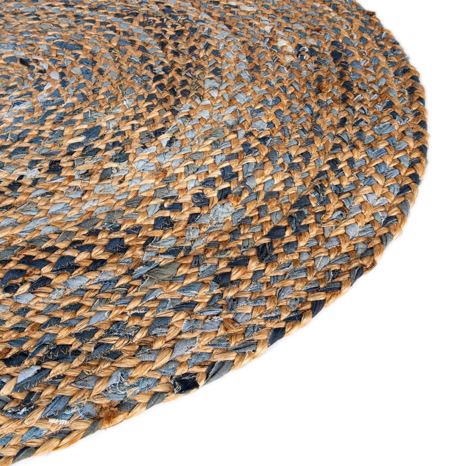 A round, braided jute and denim rug in natural brown and various shades of blue, showcasing its textured, eco-friendly design.