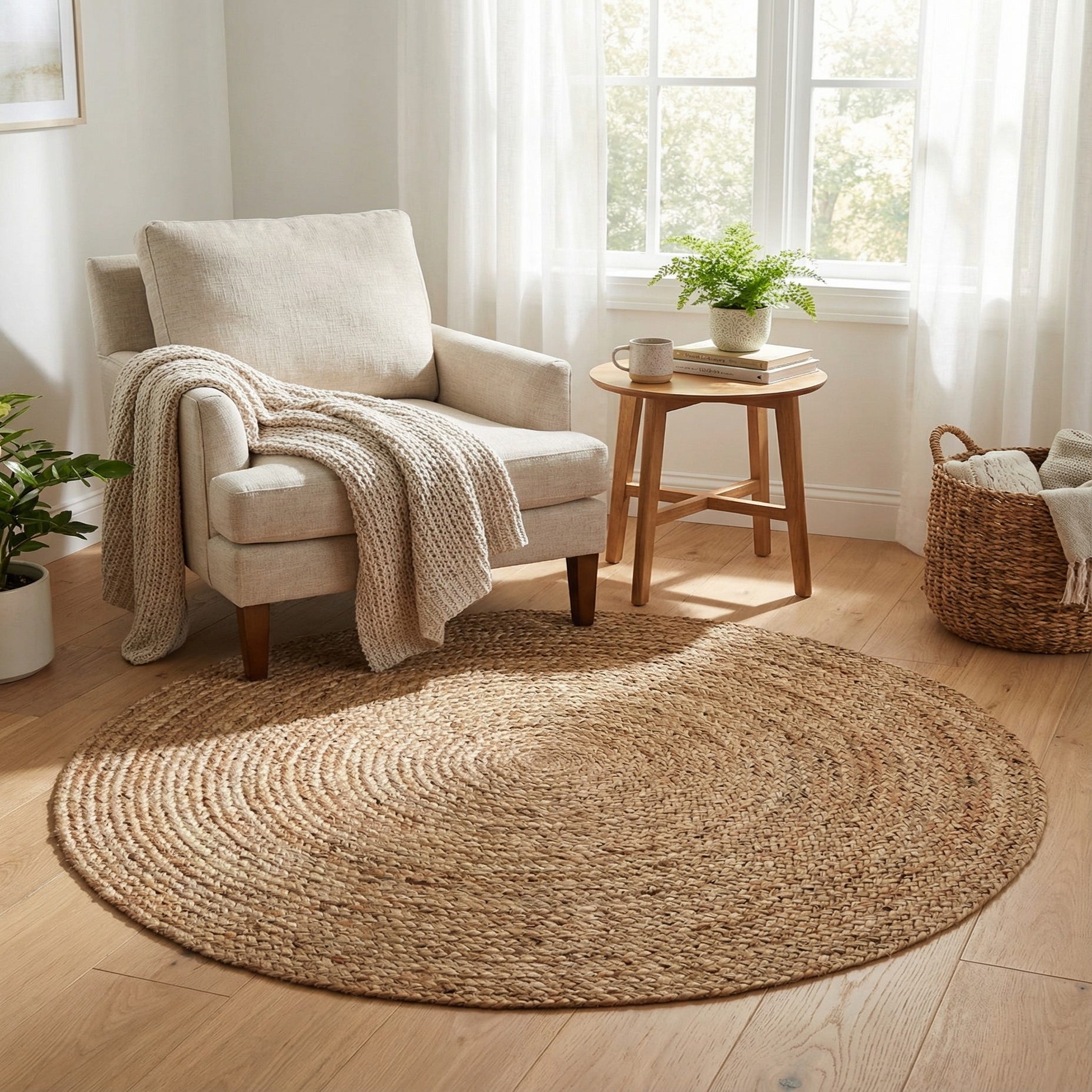 Hand-braided from 100% jute, the rug brings an organic, lived-in texture that pairs well with wood and woven accents. Place it beneath a small dining set or in an entry or reading nook, layer it over a larger neutral rug for added depth, or use it to anchor a sunroom or home office with coastal, farmhouse, boho, or modern-rustic decor. It complements linen upholstery, rattan furniture, indoor plants, and a neutral color palette for a relaxed, natural look.