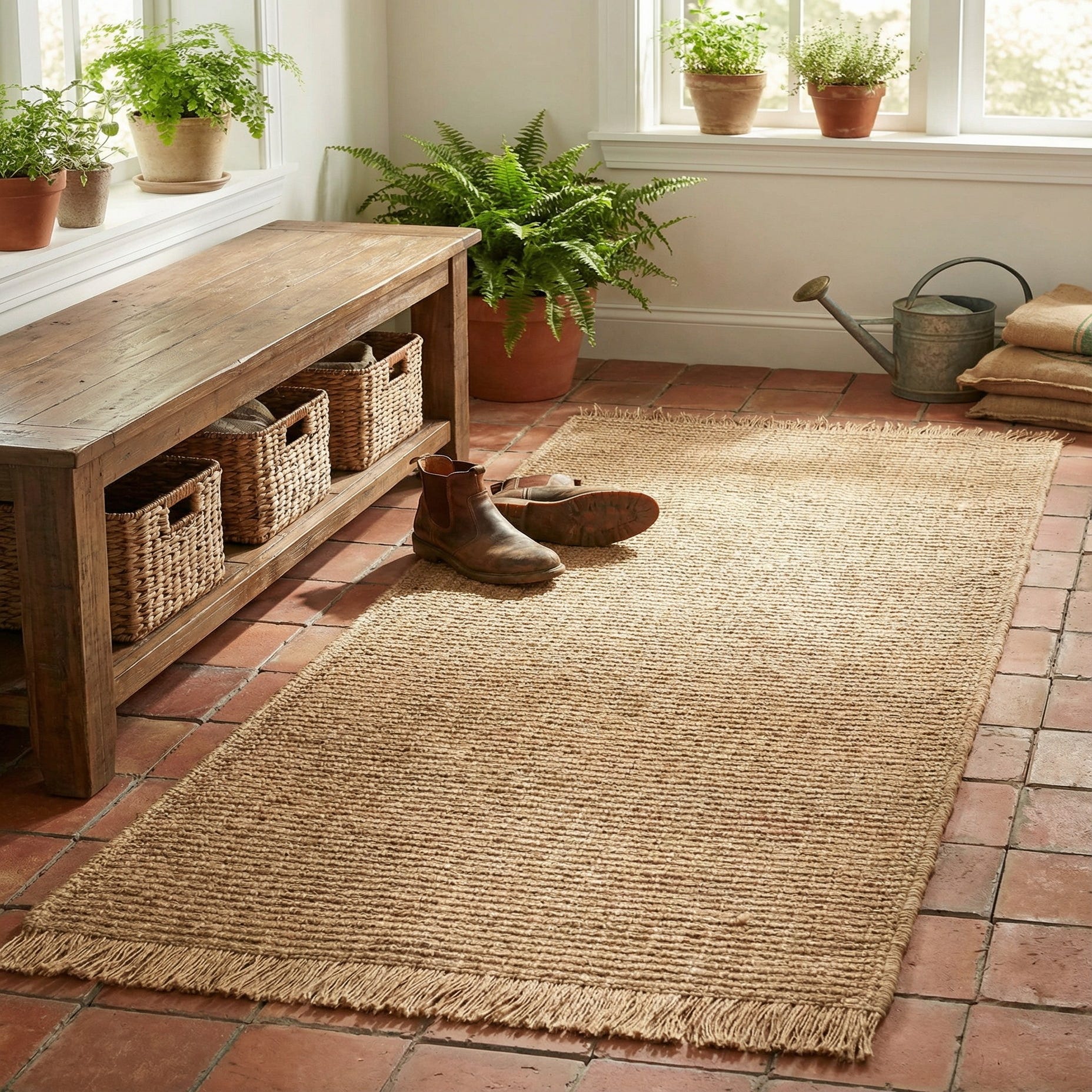 Place this runner in a hallway, entry, or narrow kitchen to add grounding natural fiber and clear definition to a traffic path. It pairs naturally with cottage, farmhouse, coastal, or casual modern interiors—think painted wood cabinets, weathered finishes, rattan accents, or a layered rug arrangement where a low-profile jute piece provides structure beneath softer layers.