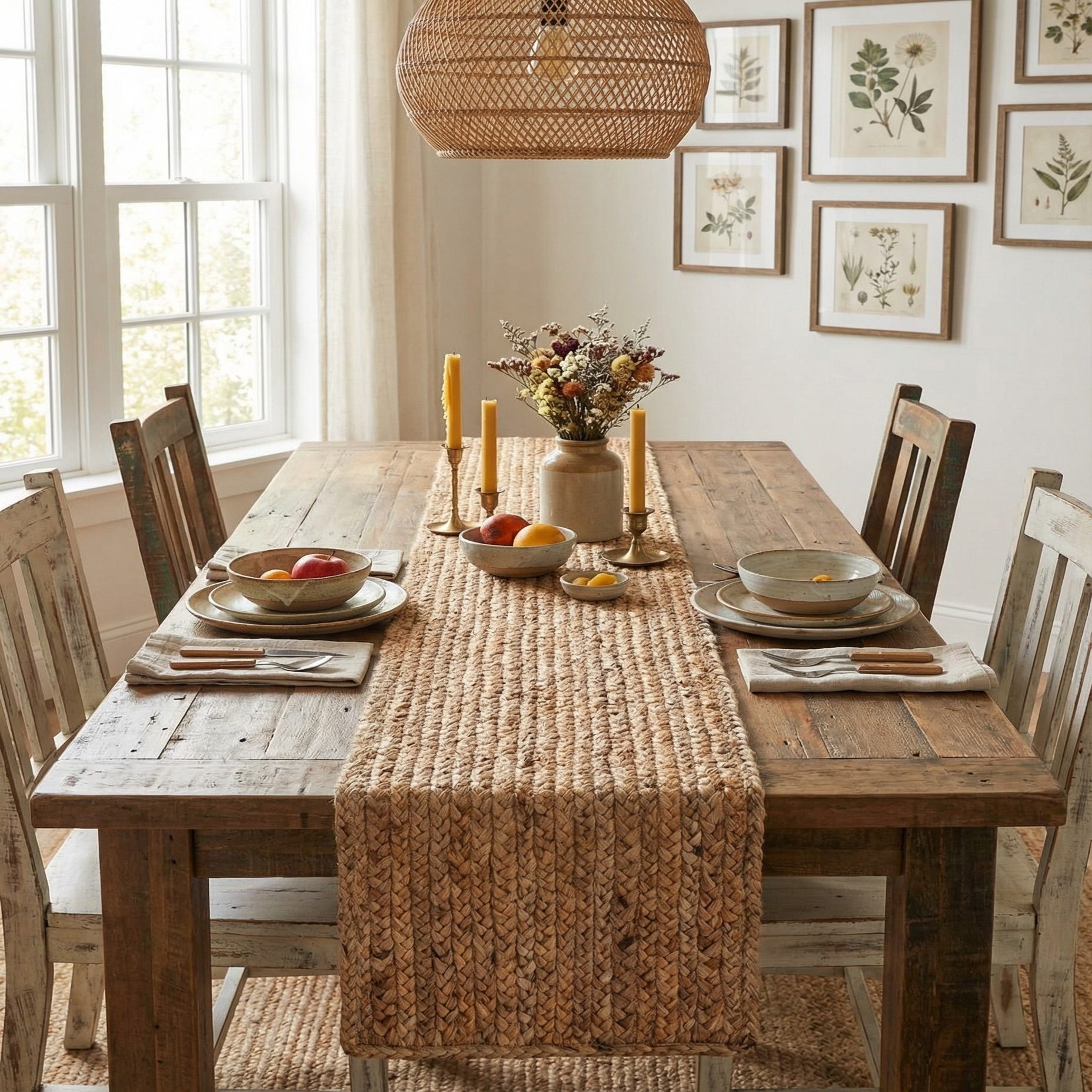 This runner pairs naturally with rustic and coastal interiors, complementing reclaimed wood or distressed finishes, woven wicker, and linen textiles. Use it on a console or entry table to add textural interest, layer it over a plain tablecloth for casual dining, or place it on a kitchen island to bring an organic, handmade touch to the space.
