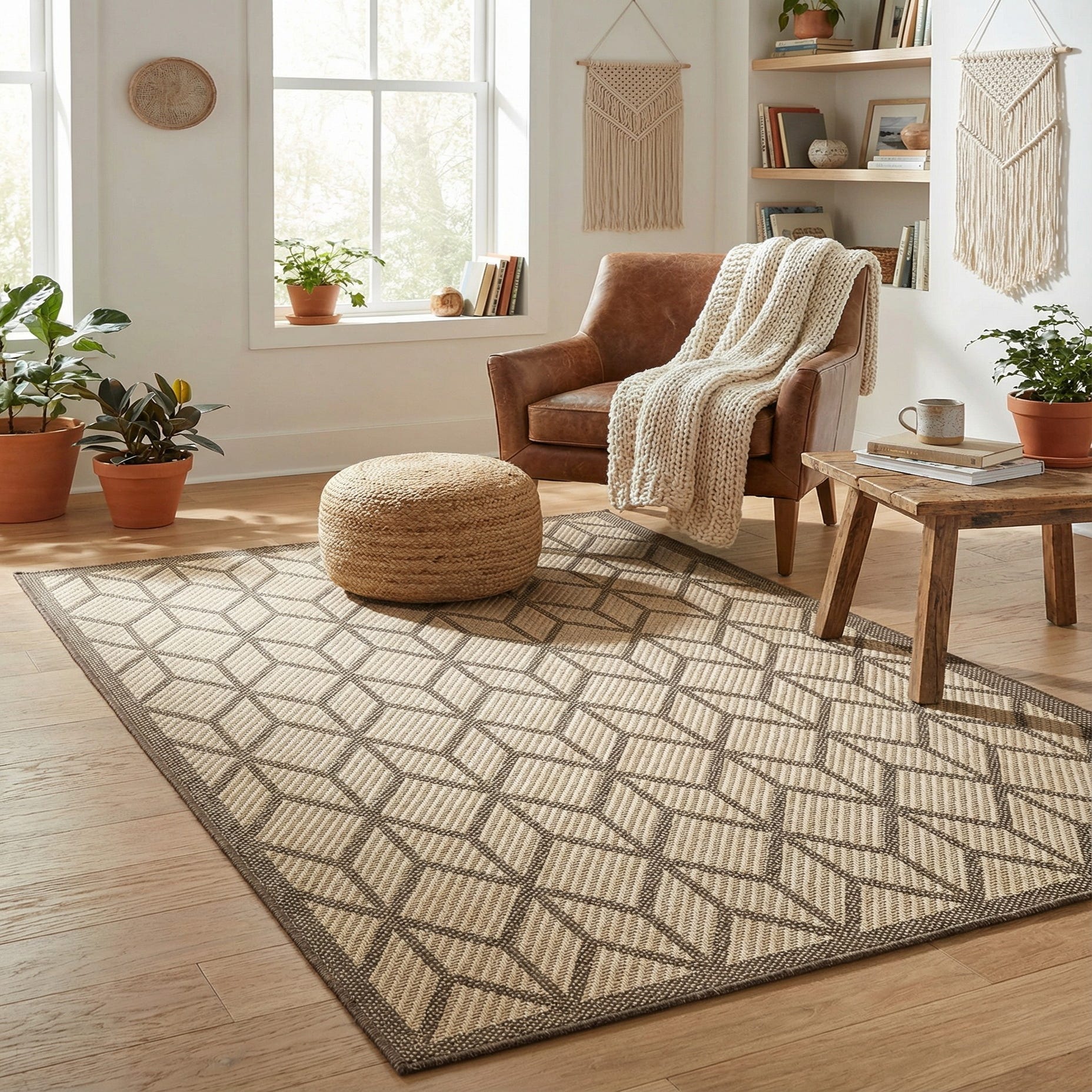 A natural-hued ground provides a soft, sandy backdrop for a crisp brown geometric lattice. The repeating chevron-and-diamond motif creates a rhythmic, modern pattern that reads clean and structured without feeling busy. The tight, low-profile polypropylene weave has a slightly textured, tactile surface—firm underfoot with the subtle grain of woven fibers visible across the field—and a neatly finished brown border that frames the design.