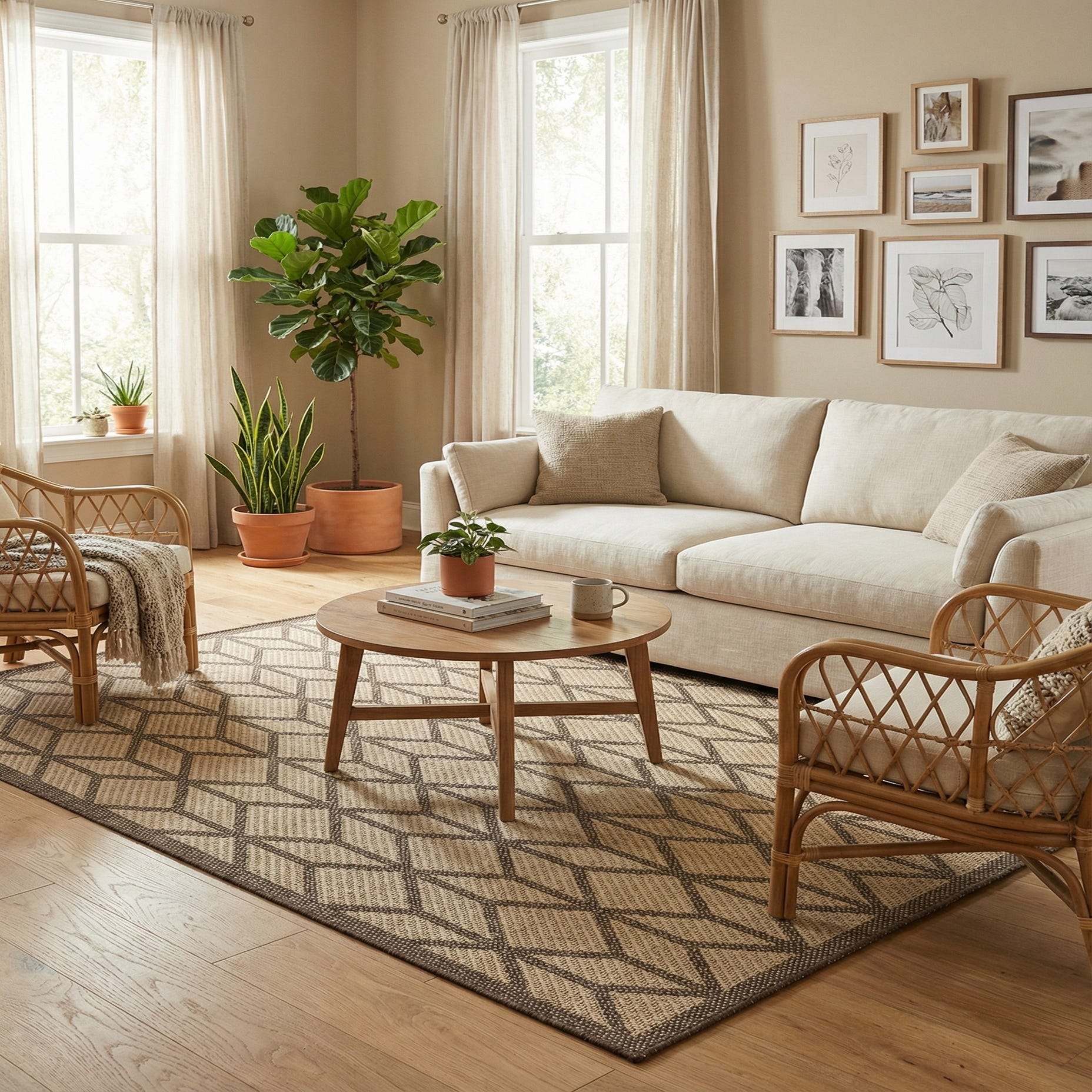 Machine-made in polypropylene, this rug works well in rooms where a neutral, graphic anchor is desired. Pair it with light wood furniture and linen fabrics for a modern farmhouse or Scandinavian look, layer it under a dining table to add visual structure to the space, or use it in an entry or covered outdoor area to introduce a calm, natural palette. The simple two-tone scheme and geometric lines also complement transitional and coastal interiors.