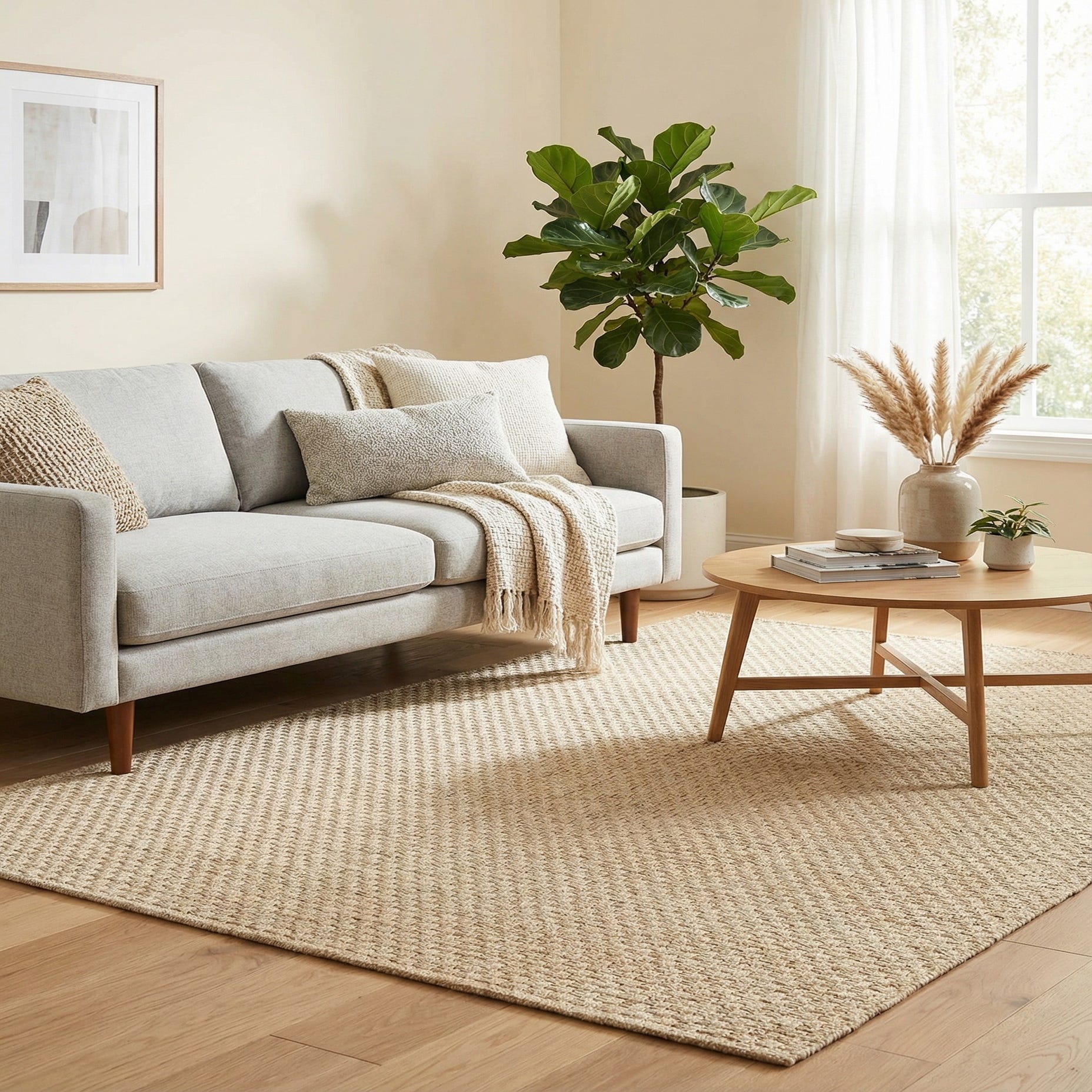 This rug works well in casual living rooms, layered under a coffee table or in front of a sofa to add warmth and definition. It also pairs nicely with coastal, modern farmhouse, or Scandinavian interiors, and makes a practical, attractive choice for a bedroom, entryway, or a small dining nook where a low-profile, durable floor covering is preferred.