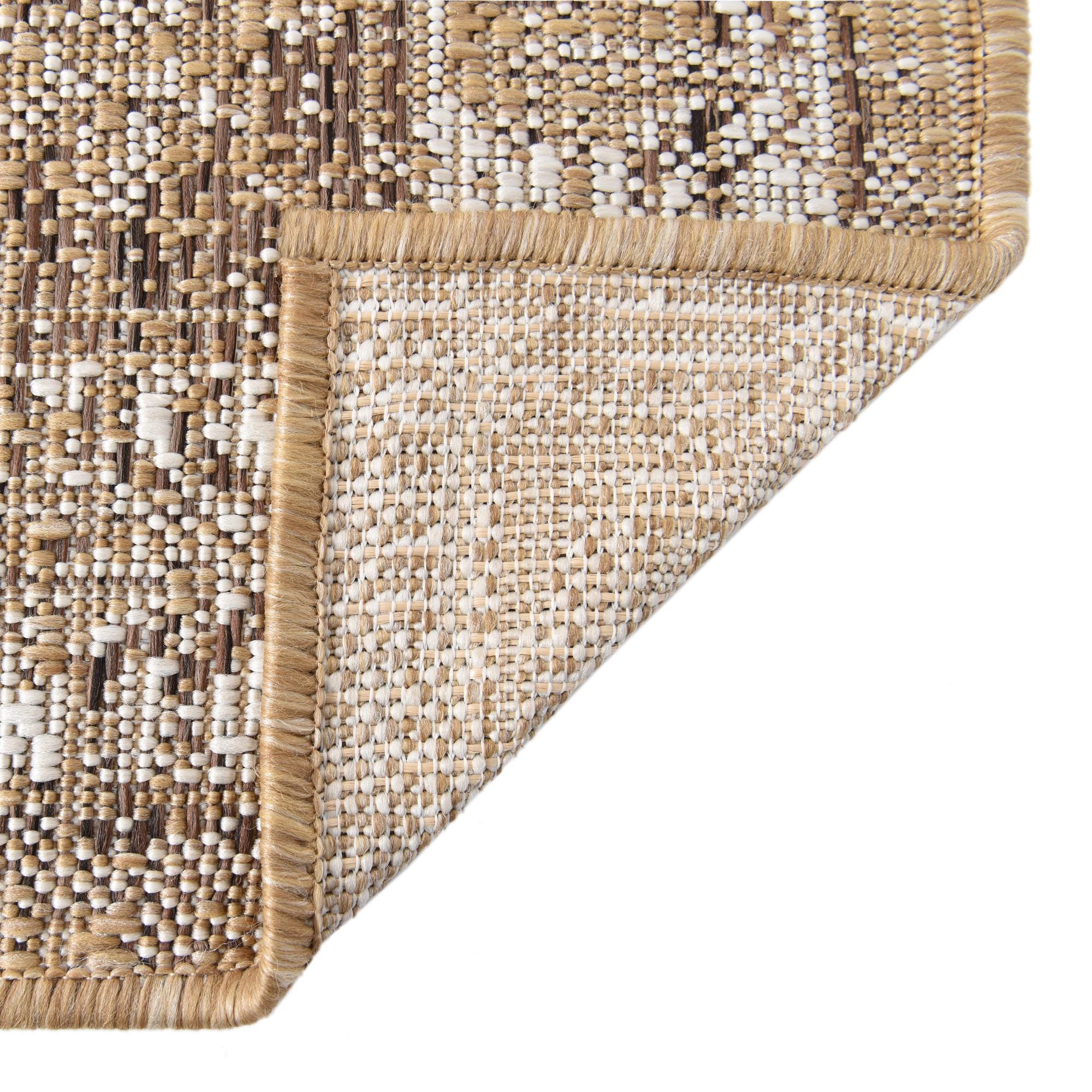 This Outdoor Traditional collection rug features a balanced octagonal shape with a predominantly natural background, accented with tastefully implemented brown and ivory hues. The rug displays a central medallion pattern surrounded by intricate detailing, reminiscent of classic design motifs found in traditional rugs. Crafted with a flatweave construction from 100% polypropylene, the rug offers a pleasant texture that can endure the demands of outdoor settings while maintaining a comfortable underfoot experience.