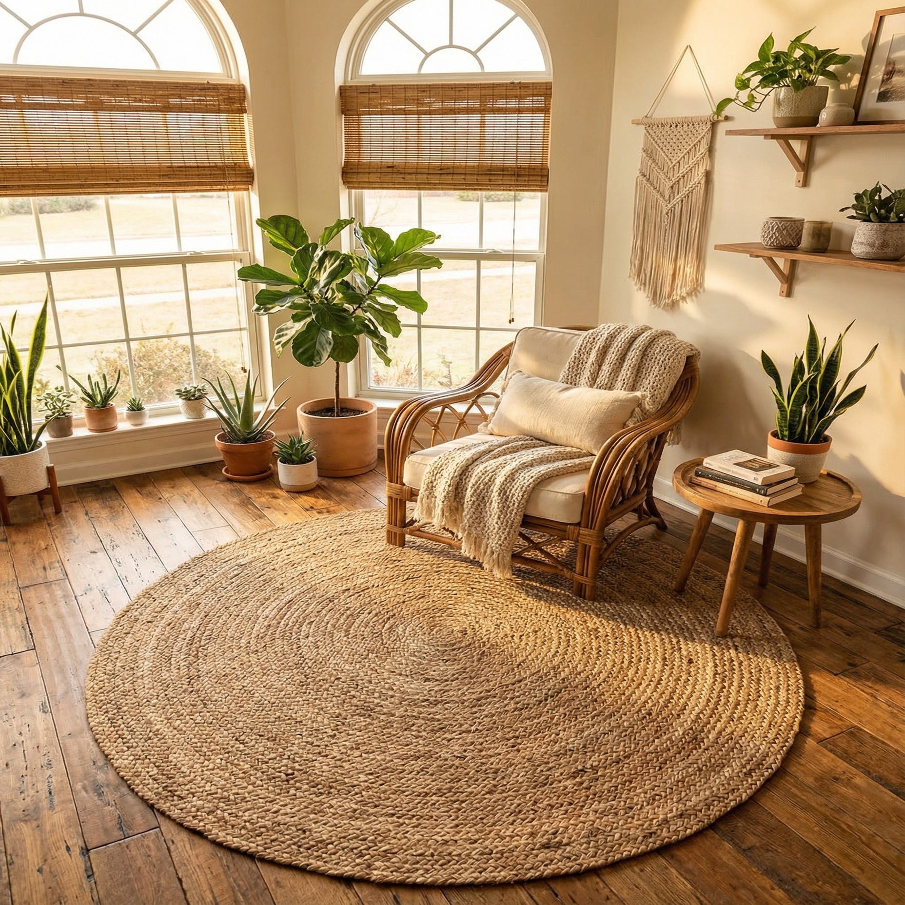 This rug works well under a round dining table, in an entryway, or layered beneath a living-room seating group to anchor a casual arrangement. It complements coastal, farmhouse, boho, and modern rustic interiors, pairing nicely with light woods, linen upholstery, woven baskets, and simple metal accents. Its natural color and texture make it an easy neutral that brings warmth and a handcrafted feel to everyday spaces.