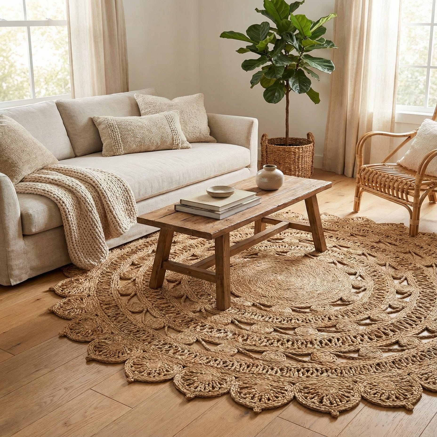 A round, natural jute rug with a braided, textured pattern featuring concentric circles and floral-like scalloped edges.