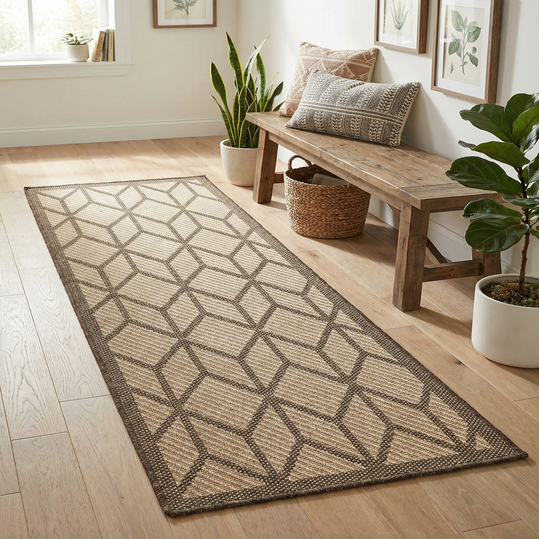 A clean geometric motif in warm brown cuts across a natural ground, forming an angular chevron-trellis pattern that gives the runner a structured, modern look. The woven surface has a subtle diagonal texture in the natural field, while the brown pattern and matching border read slightly raised against that backdrop. Machine-made from polypropylene, the rug feels firm and tightly woven underfoot with a low-profile texture that holds its shape and shows the pattern clearly.