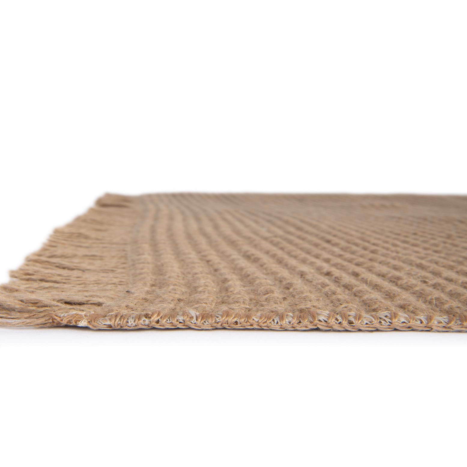 A 5'1" x 5'1" square Jute rug in a natural tan color with a rustic, textured flatweave and fringed edges.