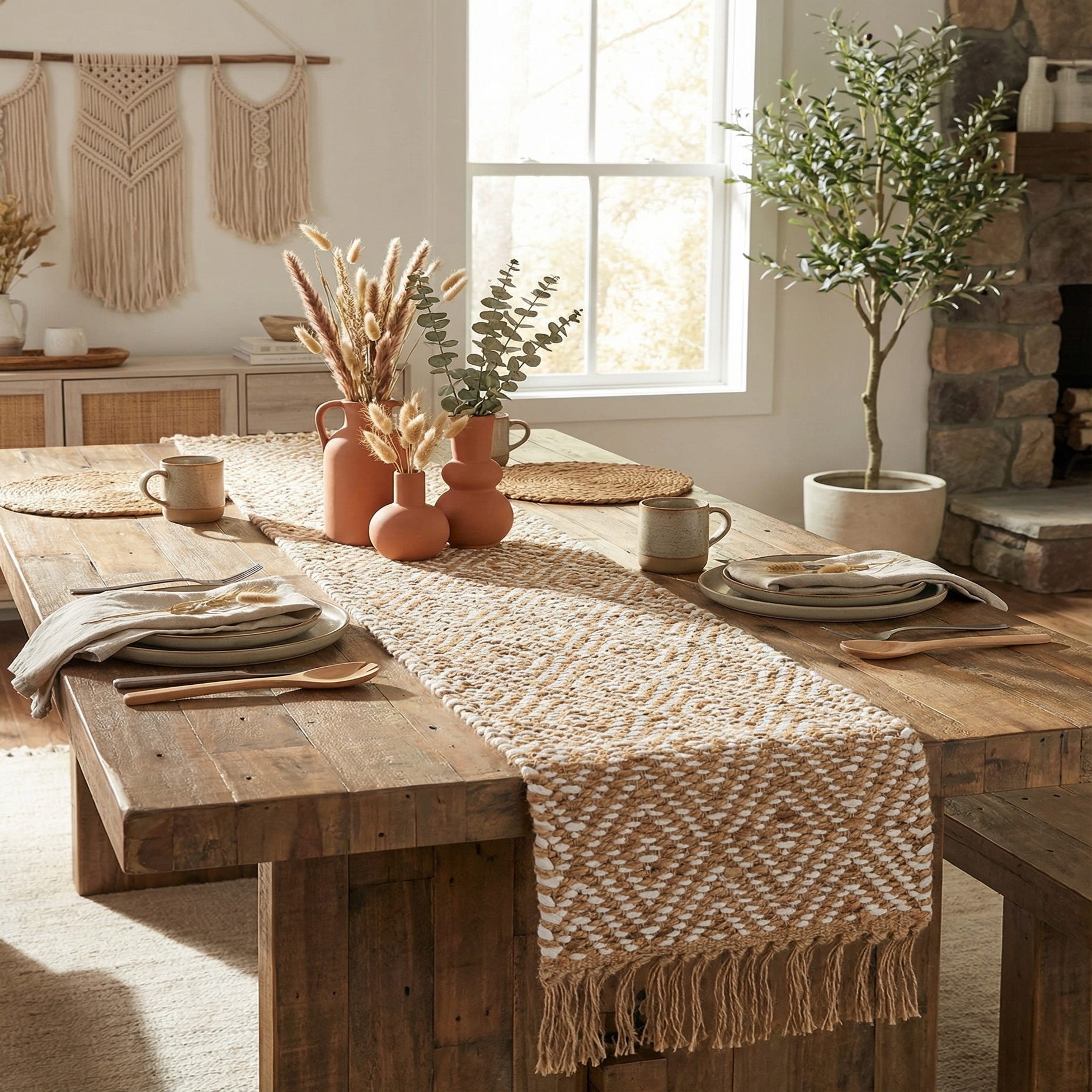 A 1' 2 x 5' 1 Braided Jute table runner with a natural brown and ivory diamond pattern and fringed ends.
