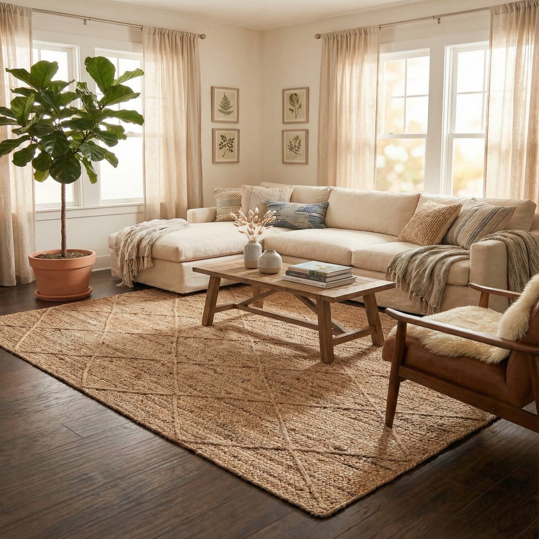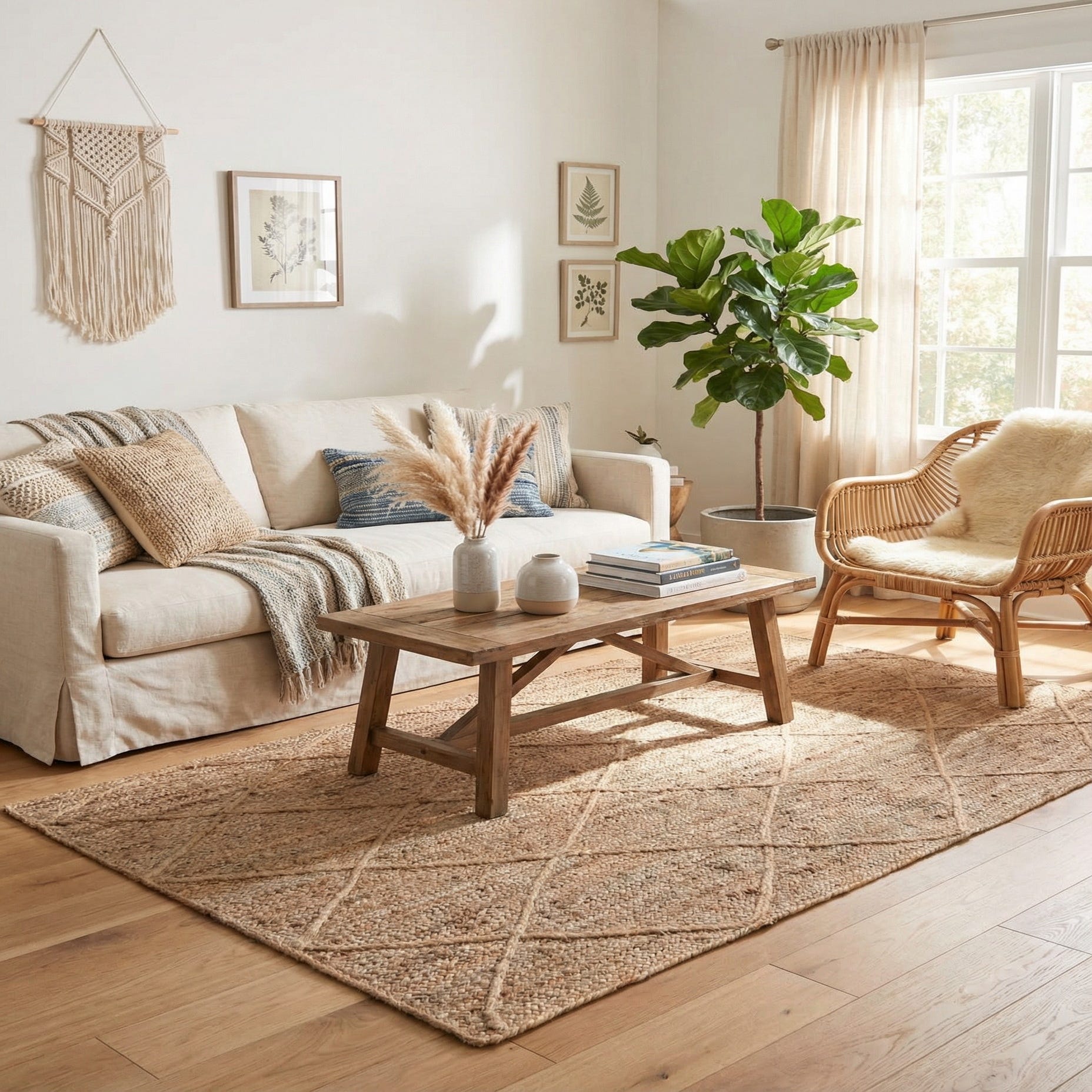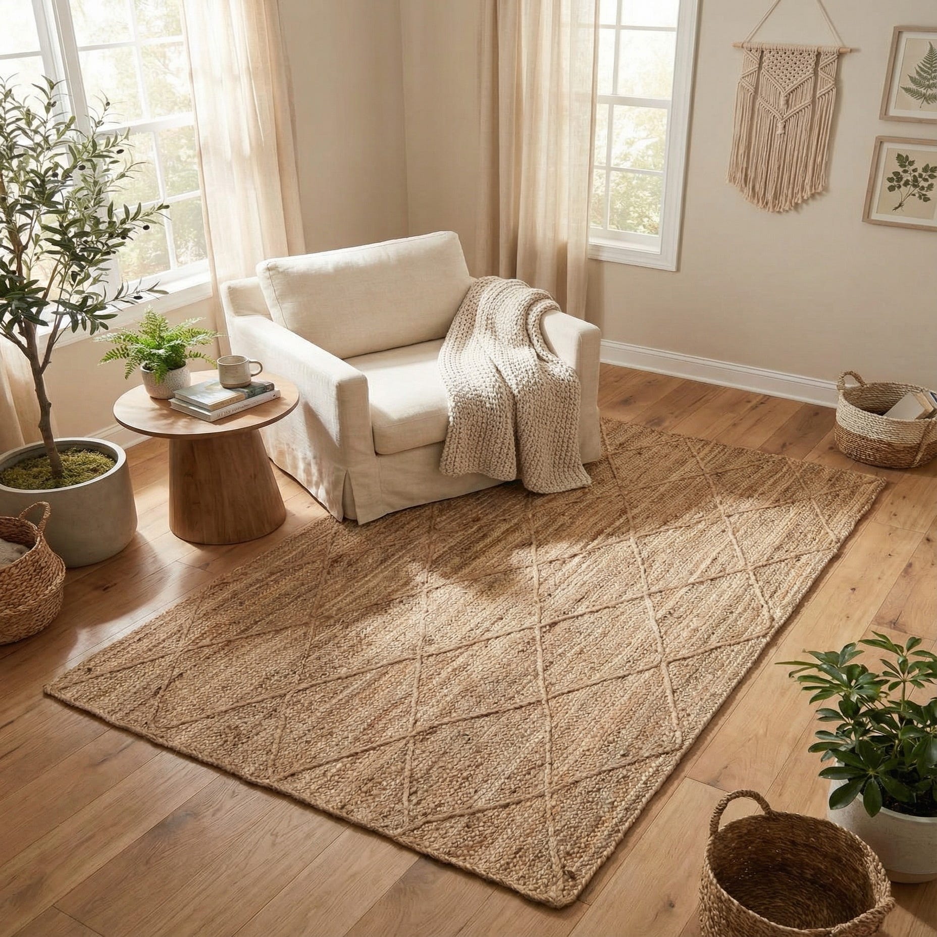 This rug works well in coastal, farmhouse, Scandinavian, or modern rustic interiors—pair it with light wood furniture, rattan accents, and linen upholstery for a relaxed, layered aesthetic. Use it to define a small living area or an intimate dining nook, set it in an entryway to introduce natural texture, or place it in a bedroom to add warmth and subtle pattern without competing with other design elements.