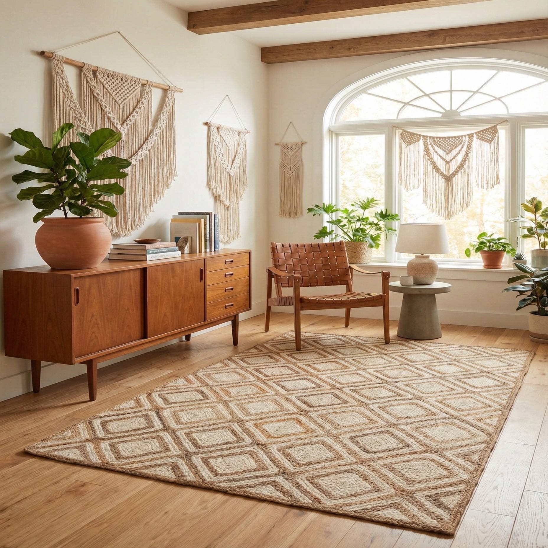 This rug works well in casual and lived-in interiors such as coastal, farmhouse, modern rustic, or bohemian schemes. Place it to anchor a seating group, beneath a dining table, or layered with a softer rug in a bedroom to introduce natural texture. Pair with light wood furniture, linen upholstery, rattan or wicker accents, and muted textiles to enhance the woven, organic quality of the piece.
