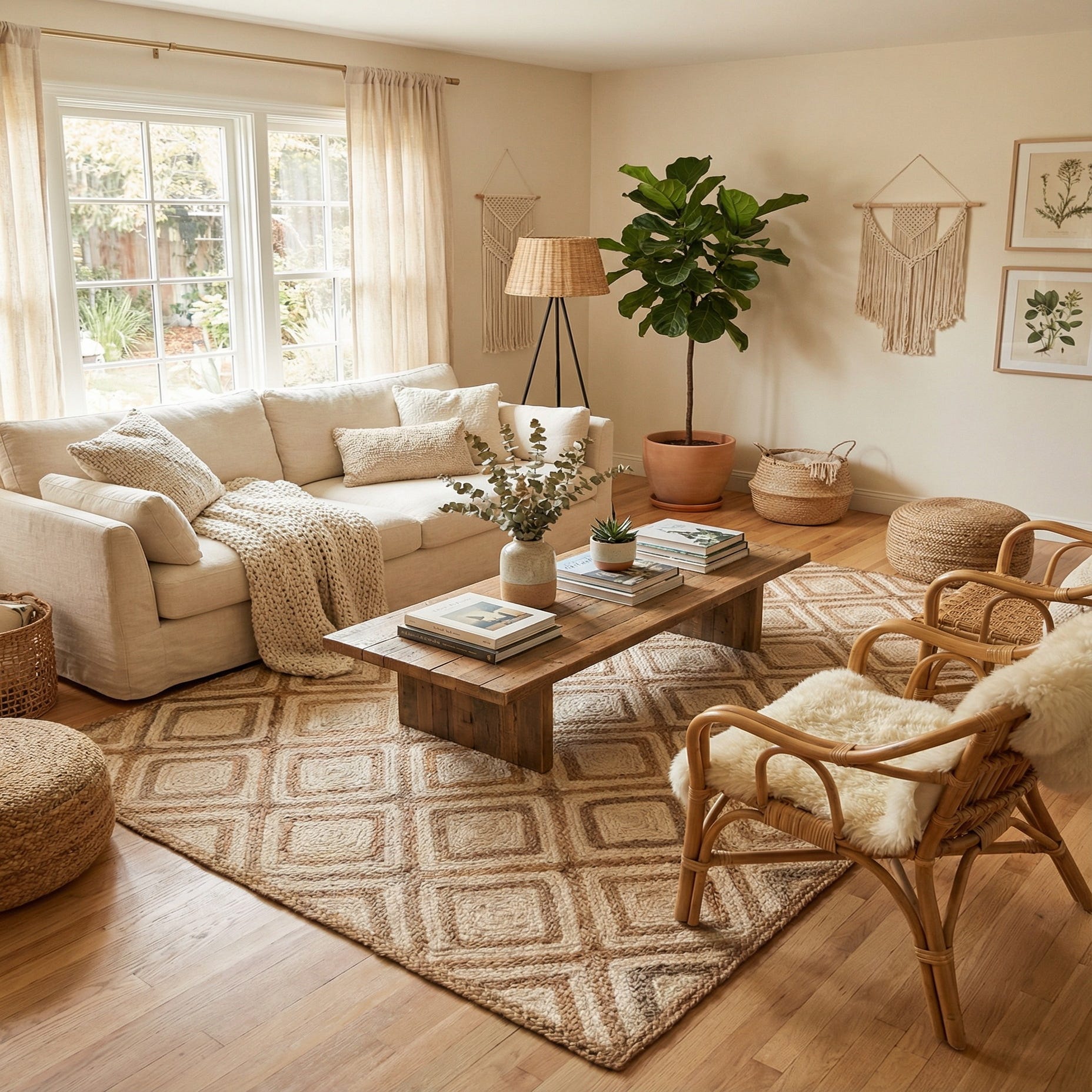This rug works well in casual and lived-in interiors such as coastal, farmhouse, modern rustic, or bohemian schemes. Place it to anchor a seating group, beneath a dining table, or layered with a softer rug in a bedroom to introduce natural texture. Pair with light wood furniture, linen upholstery, rattan or wicker accents, and muted textiles to enhance the woven, organic quality of the piece.