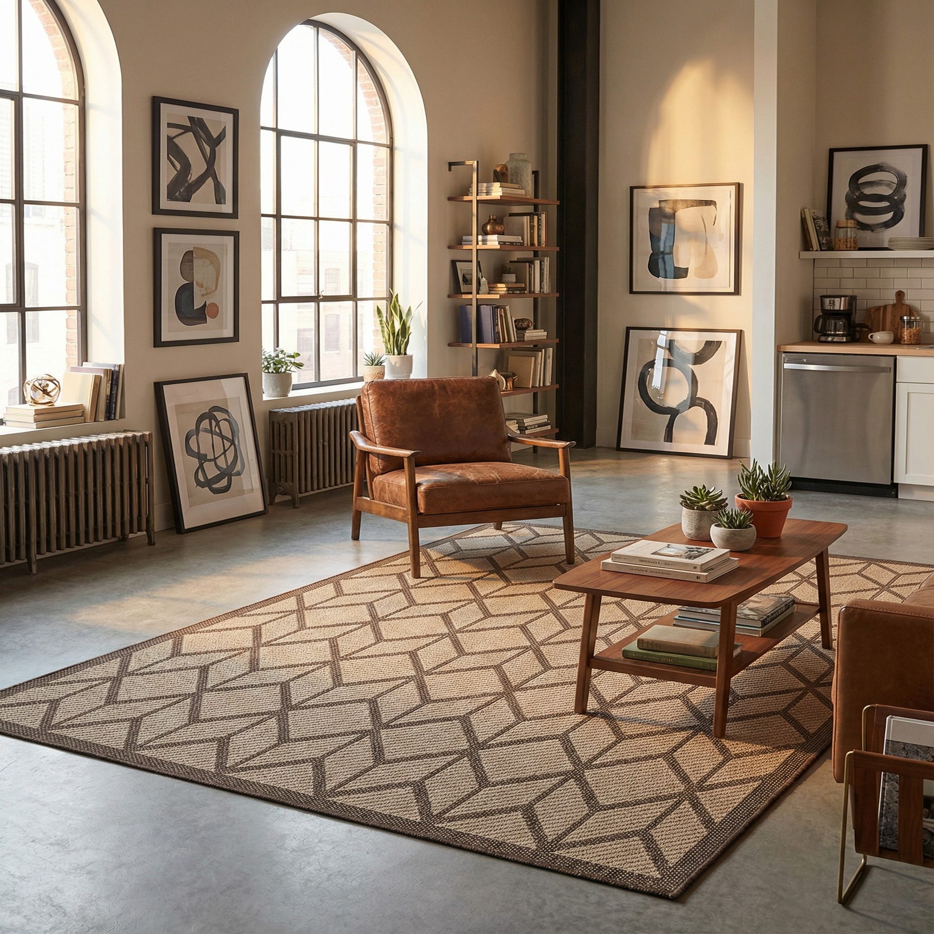 A graphic geometric pattern of interlocking chevrons and diamonds in warm brown sits on a natural ground, creating a rhythmic, modern-trellis look. Narrow brown lines form crisp V-shaped motifs across the field and a slim brown border frames the piece. Machine-made polypropylene gives the rug a low-profile, flatwoven surface with a firm hand—run your fingers across it and you’ll feel a subtle woven texture and well-defined pattern edges rather than a plush pile.