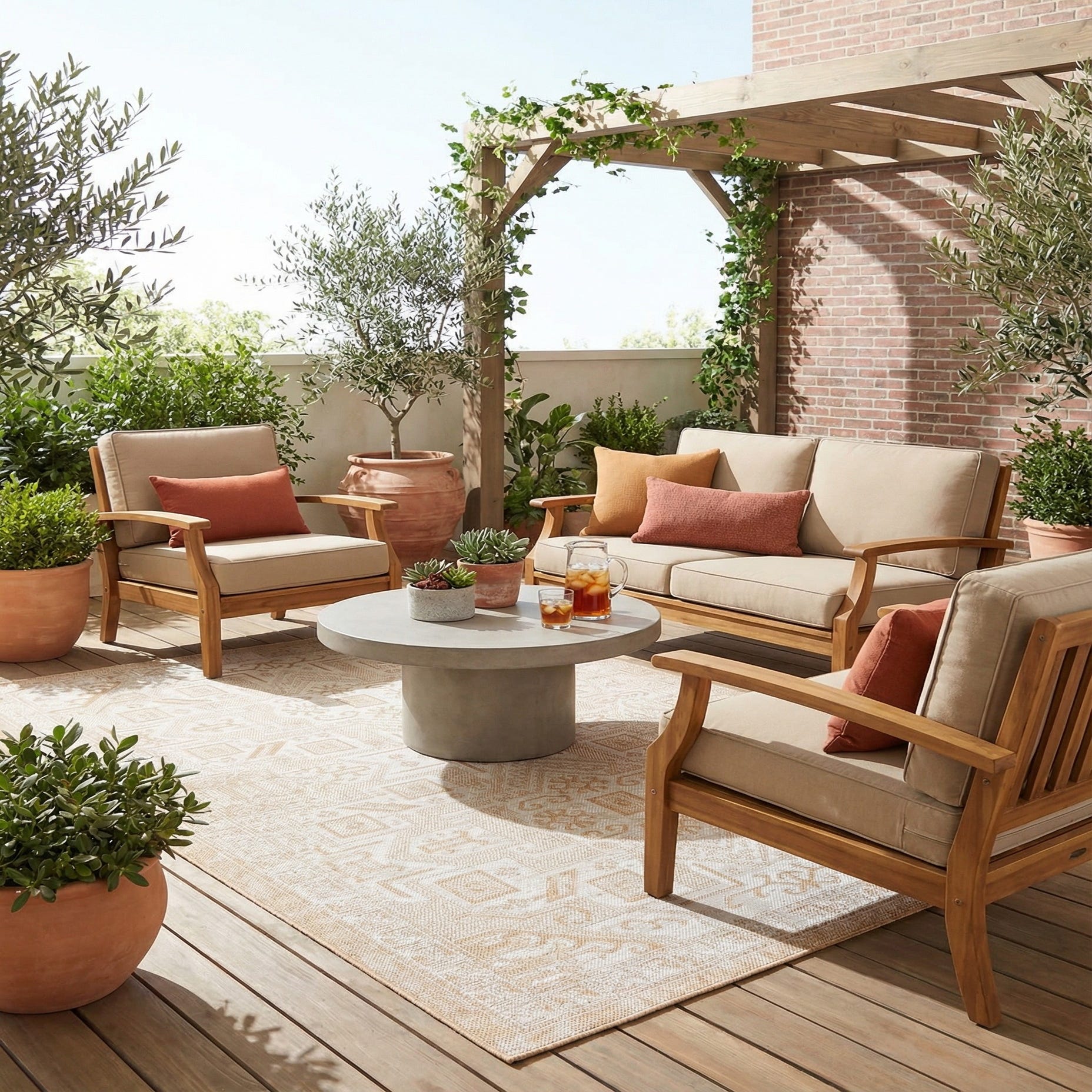 This piece works well on a covered patio, sunroom, or any high-traffic living space where a grounded, neutral anchor is needed. Pair it with rattan seating, linen upholstery, and warm wood finishes for a relaxed, coastal-meets-Southwestern vibe, or slot it into a modern farmhouse or minimalist scheme to add subtle pattern and texture. It also fits nicely under a small outdoor dining set or in front of a porch bench to define a cozy conversation area.