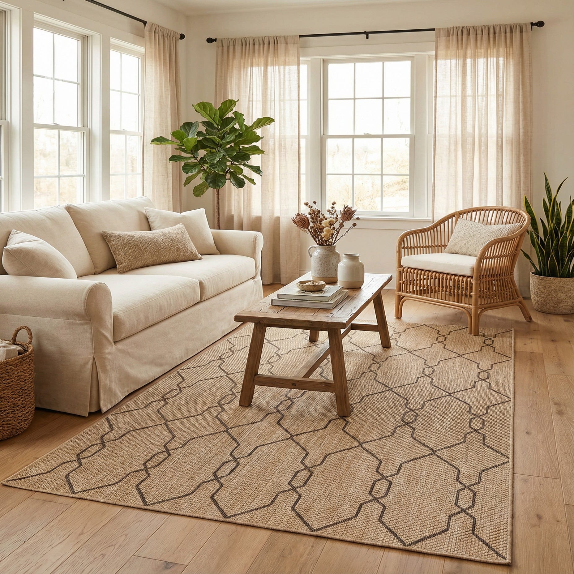 This piece works well on a covered patio or sunroom, layered beneath a casual dining set, or placed in a living room with warm wood and rattan furnishings. Pair it with crisp whites and natural linens for a coastal or farmhouse vibe, or anchor a contemporary seating area with deep neutrals and metal accents for a more tailored look. Its balanced pattern and neutral palette make it easy to coordinate across indoor or outdoor-adjacent spaces where a clean, structured aesthetic is desired.