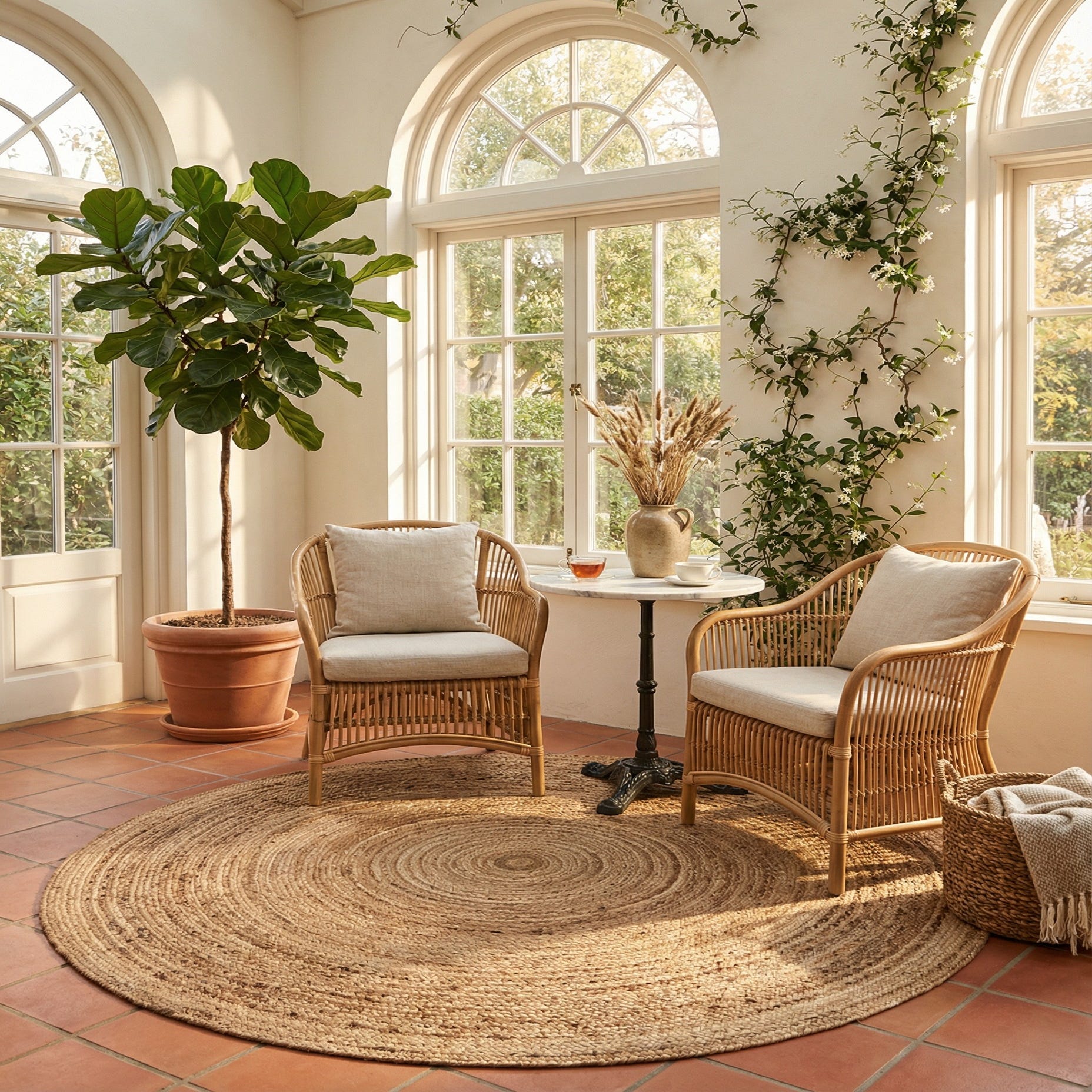 The rug’s organic style pairs easily with coastal, farmhouse, bohemian, or modern rustic interiors. Use it to anchor a round dining table, layer it under a coffee table on hardwood floors, or place it in an entry or sunroom to introduce texture and warmth. It complements linen upholstery, rattan or wicker furnishings, and matte metal accents for a relaxed, natural aesthetic.