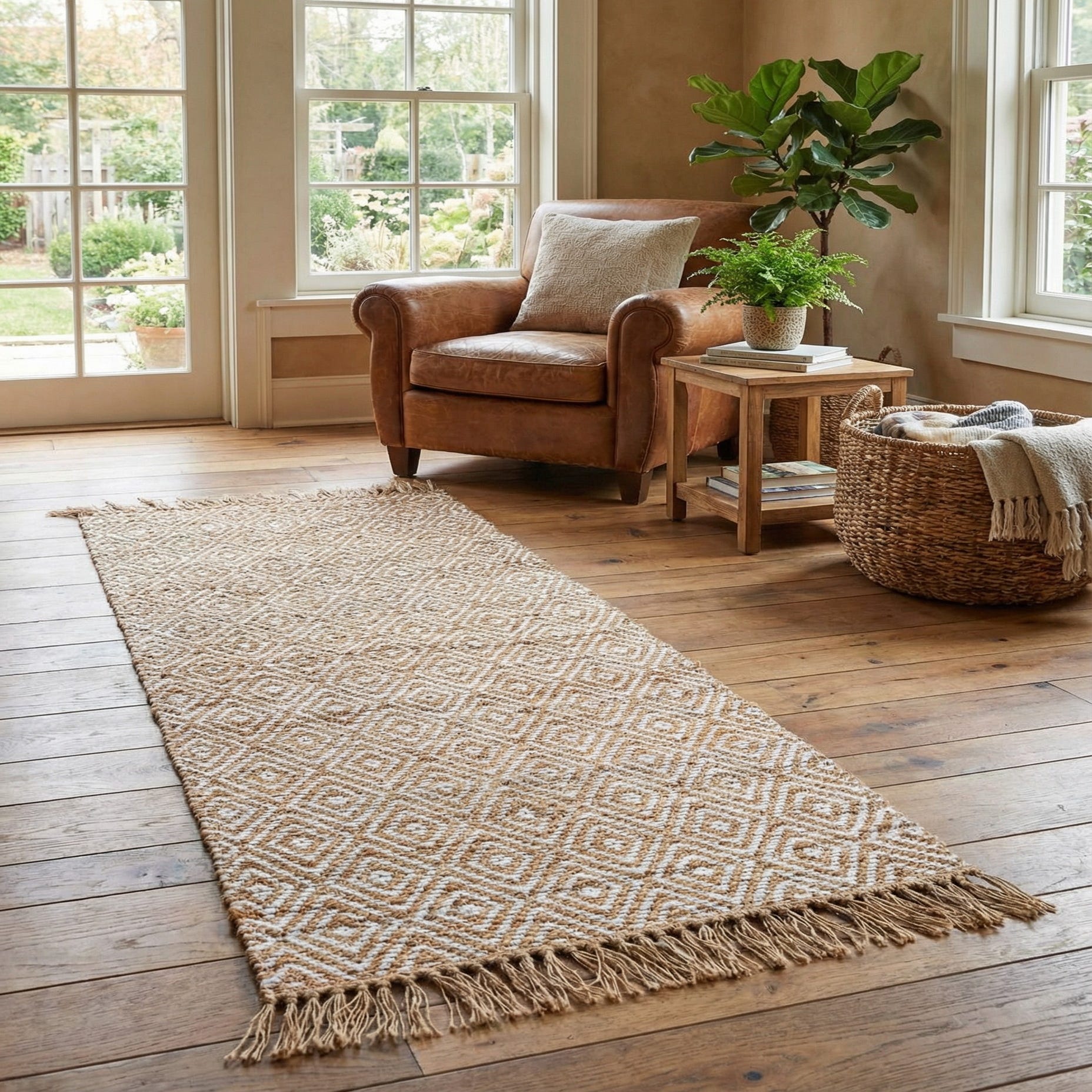A braided diamond motif in natural and ivory creates a classic, textural look that reads clean and casual. Hand woven from 60% cotton and 40% jute, the surface has a low-profile, braided flatweave with a slightly nubby hand where the jute’s rustic fiber meets the softer cotton strands. The natural base color is punctuated by the ivory diamonds and finished with short fringed ends for a relaxed, lived-in feel.