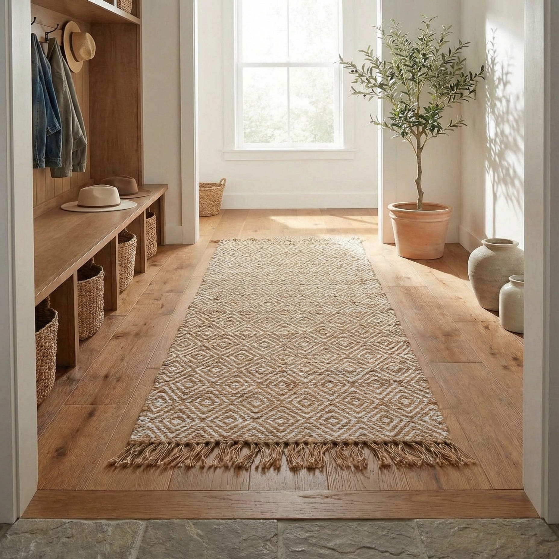 Designed as a runner, this piece works well in hallways and entryways or alongside a kitchen workspace to add layered texture underfoot. It complements coastal and farmhouse schemes as easily as modern boho, Scandinavian, or transitional interiors—pair it with weathered woods, rattan accents, linen upholstery, or simple ceramics to reinforce a warm, natural palette.
