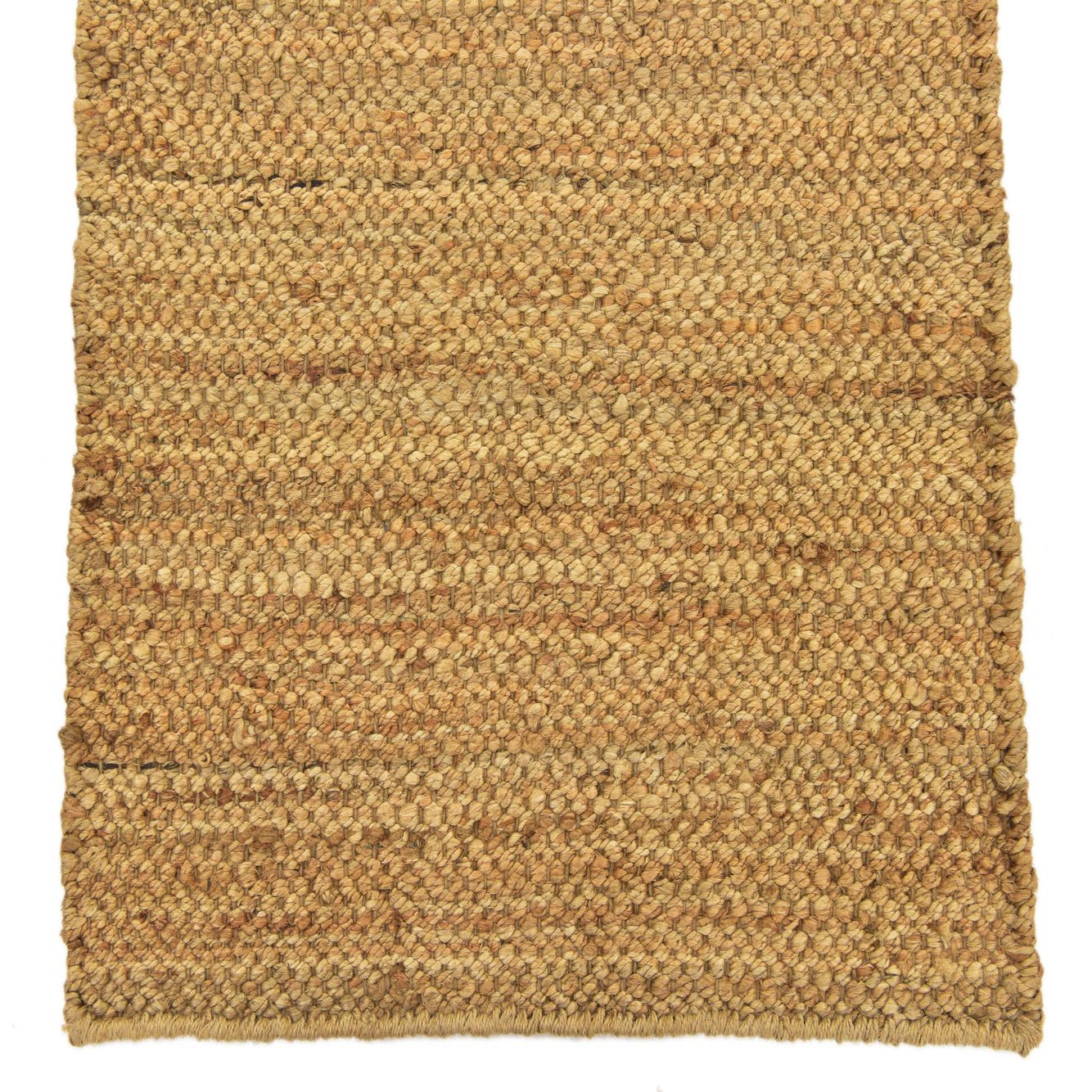Hand-woven from 100% jute, this runner shows a chunky, tightly braided weave that creates a simple, linear pattern across the surface. The natural background carries warm beige and tan tones with subtle variation in the fiber, giving the piece a layered, organic look. The texture is tactile and slightly nubby underfoot—firm and substantial rather than plush—so you can feel the handcrafted weave when you run your hand across it.