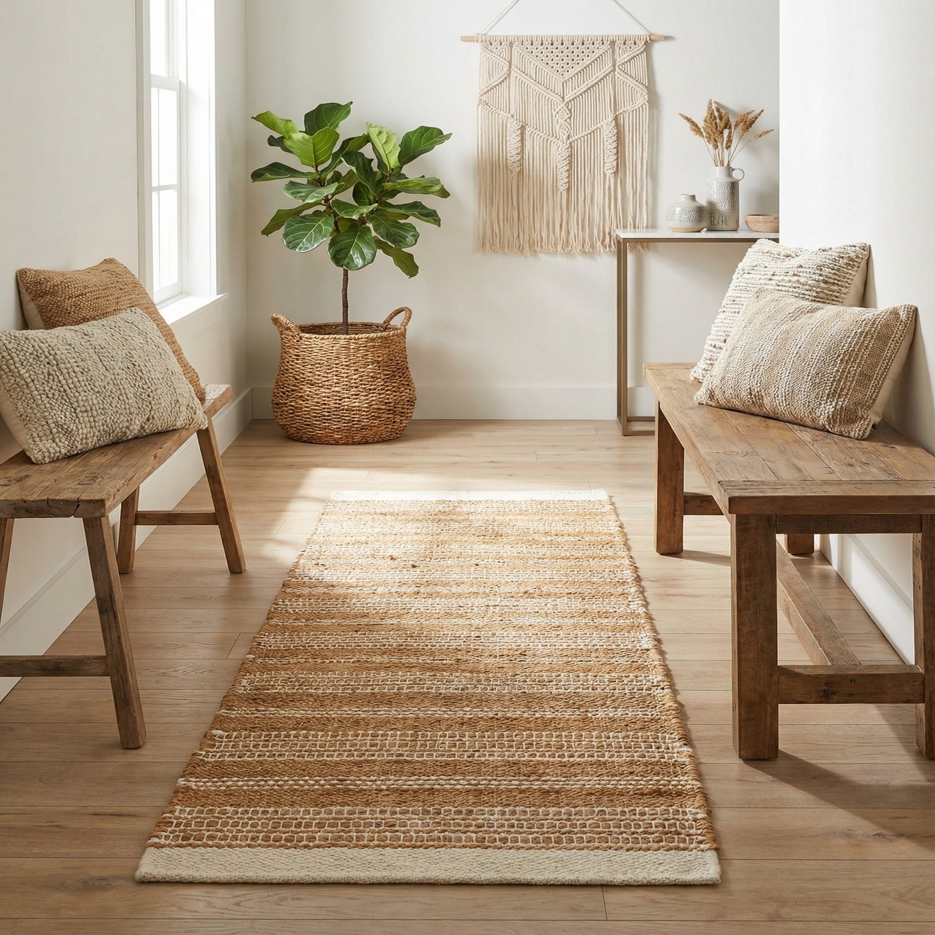 This piece works well in coastal, farmhouse, or casual contemporary settings. Use it to define a narrow entryway or hallway, place it in front of a kitchen sink to add natural warmth, or layer it in a living area alongside light wood furniture, linen upholstery, and woven baskets. The neutral natural and ivory palette pairs easily with oak, rattan, leather, and white-painted trim for a relaxed, grounded look.