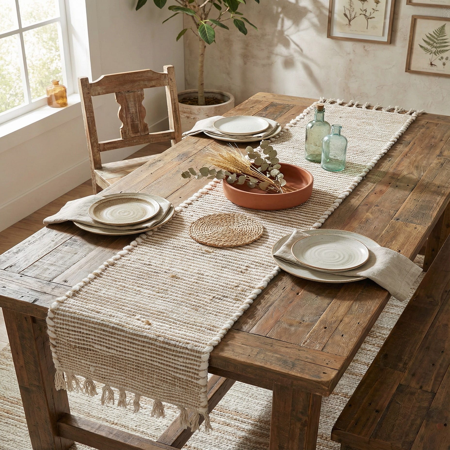 Works well as the central layer on a wooden dining table, across a console or sideboard, or down the length of a kitchen island. The neutral natural-and-ivory palette fits coastal, farmhouse, Scandinavian, and relaxed modern spaces—pair it with rattan or oak furniture, white stoneware, and linen textiles for a calm, textured setting.