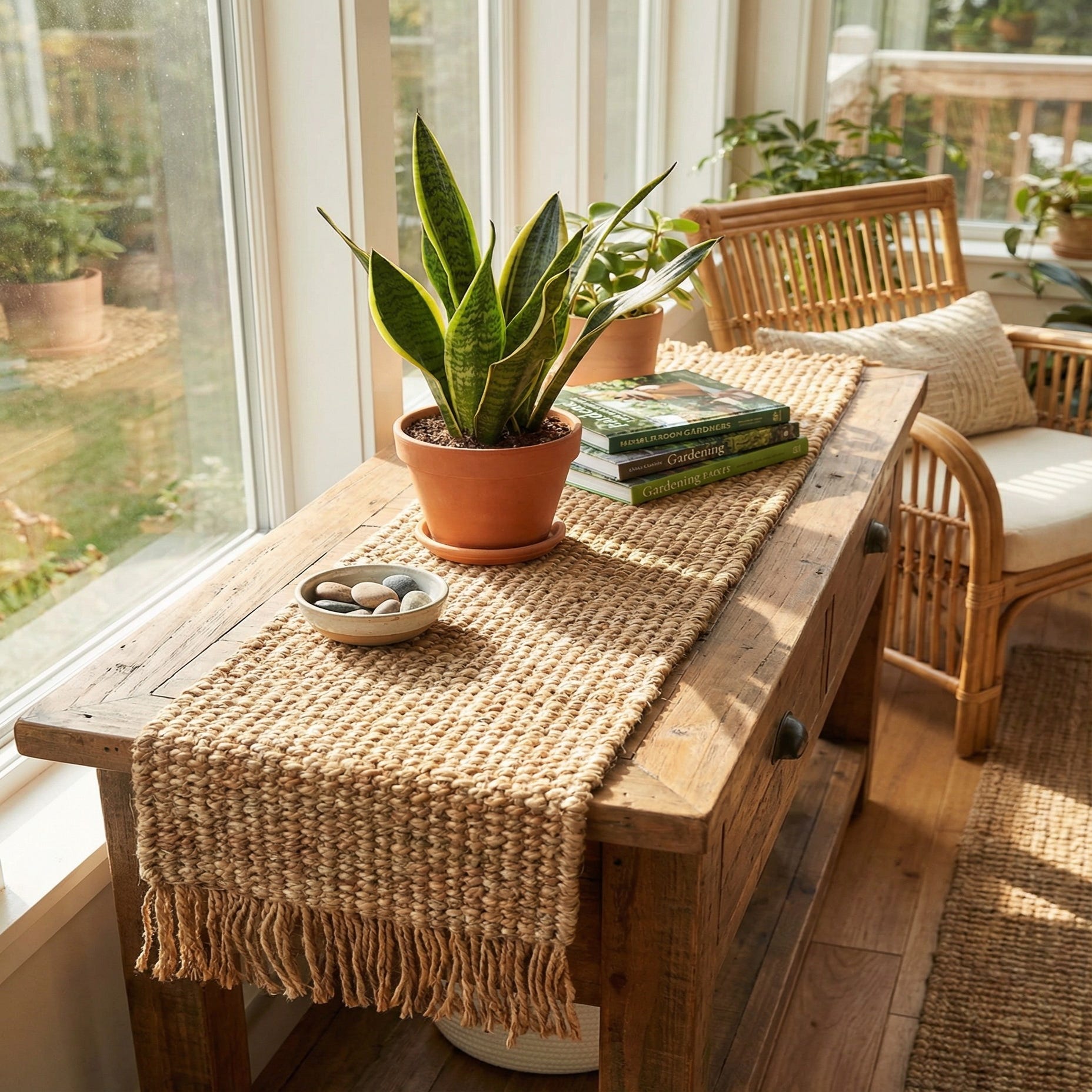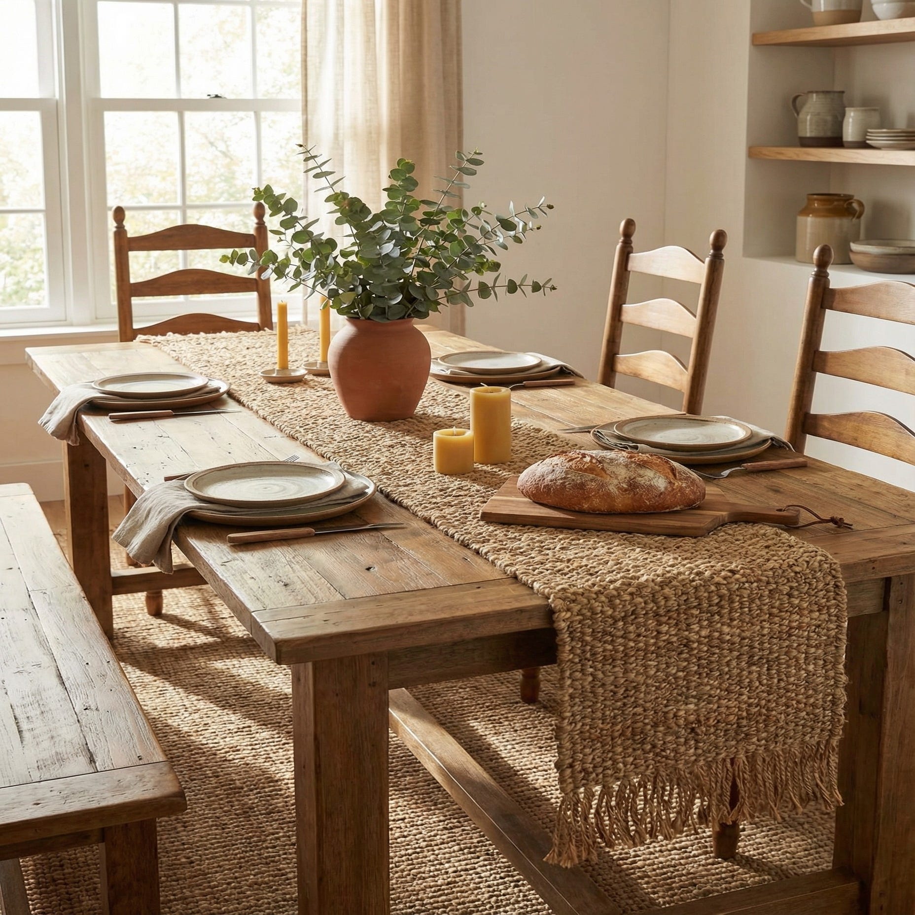 This runner works well on a wood dining table to add tactile contrast or layered over a light linen cloth for a relaxed, modern farmhouse table setting. It also suits an entry console, a kitchen island centerpiece, or a bench, pairing easily with ceramic dinnerware, woven baskets, rattan seating, and leafy greenery to bring warmth and texture into coastal, bohemian, Scandinavian, or rustic interiors.