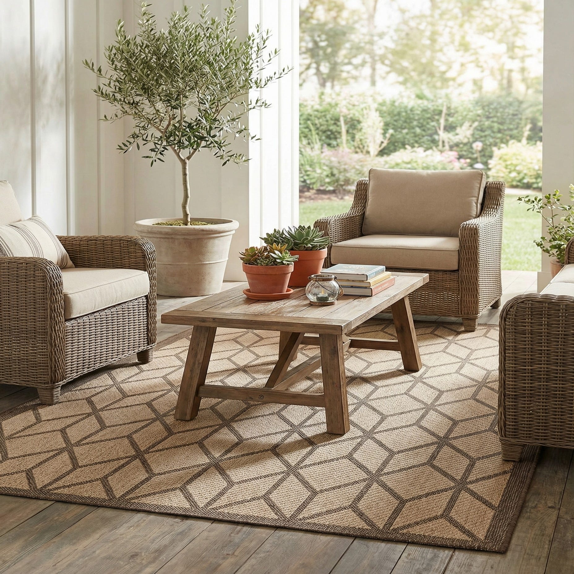 A crisp geometric lattice of elongated hexagons and diamond shapes is rendered in warm brown against a natural field, creating a clean, structured look with a soft, neutral palette. The diagonal ribbing inside each shape adds subtle depth and a tactile contrast to the smooth background, while a narrow brown border frames the design. Machine-made from polypropylene, the construction produces a low-profile, tightly woven surface that feels firm underfoot with slight texture where the pattern is woven.