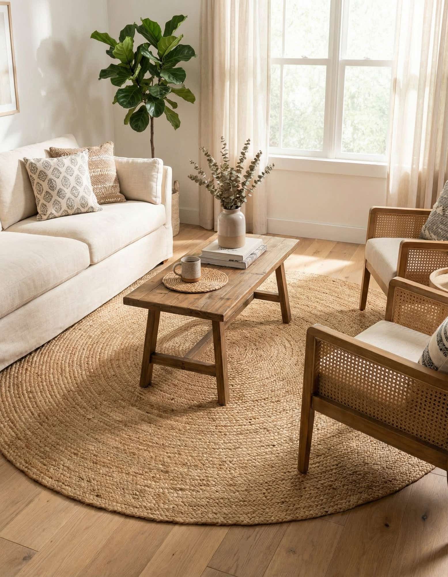 Well suited for casual and contemporary interiors, this rug pairs easily with linen upholstery, rattan or leather seating, and reclaimed wood furniture. Place it under a round dining table, in an entryway to define a foyer, or layered on hardwoods in a living room or sunroom to introduce warmth and texture. It also complements coastal, farmhouse, and modern organic schemes—add greenery and metal accents for contrast or keep the palette soft and neutral for a calm, cohesive look.