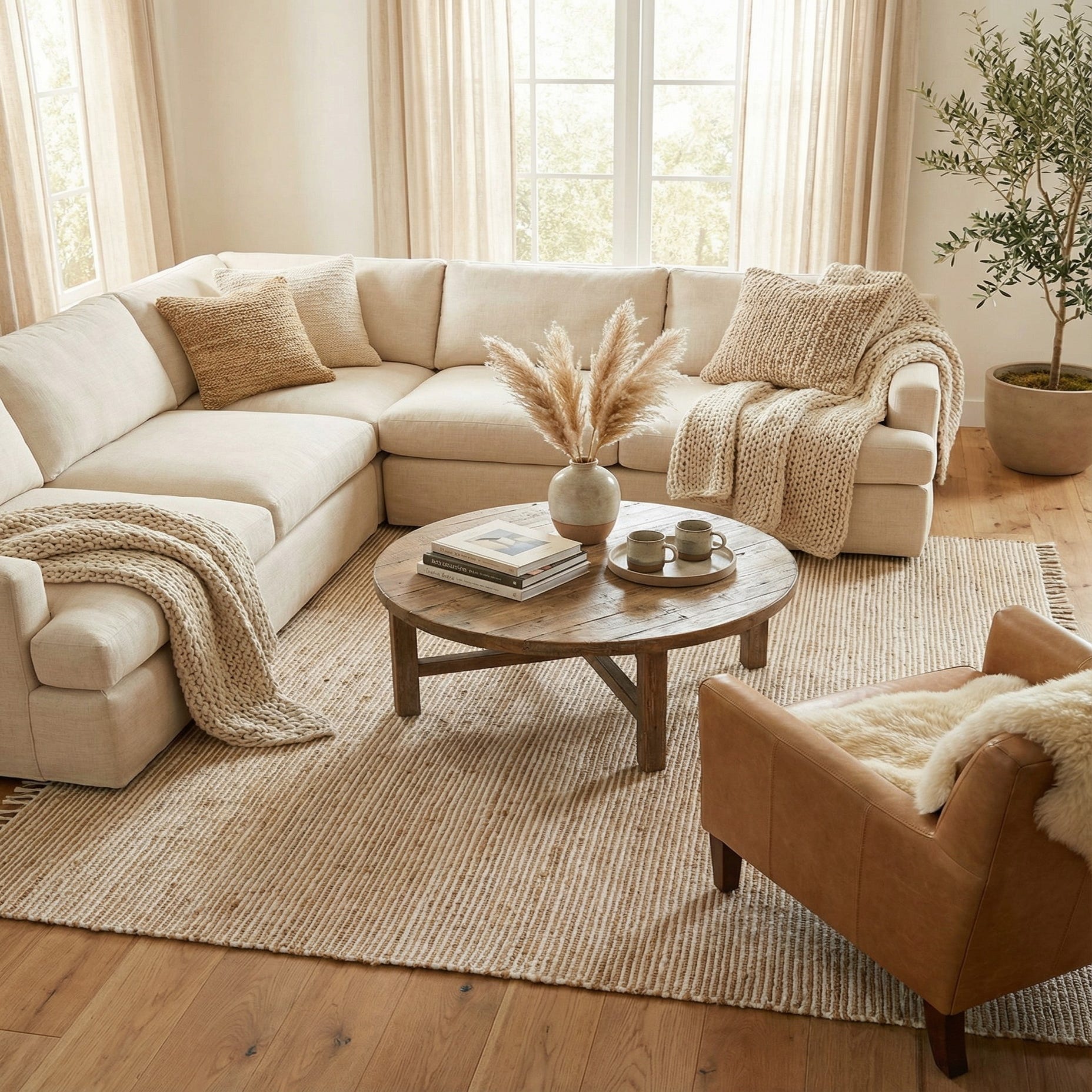This rug works well in relaxed, lived-in spaces: place it under a coffee table in a casual living room, layer it in a coastal or Scandinavian-style bedroom, or use it in a dining area where a low-profile weave is preferred. Its natural palette and tactile mix of fibers also complement farmhouse, boho, and minimalist interiors, providing a grounded base that supports a range of furnishings and textures.