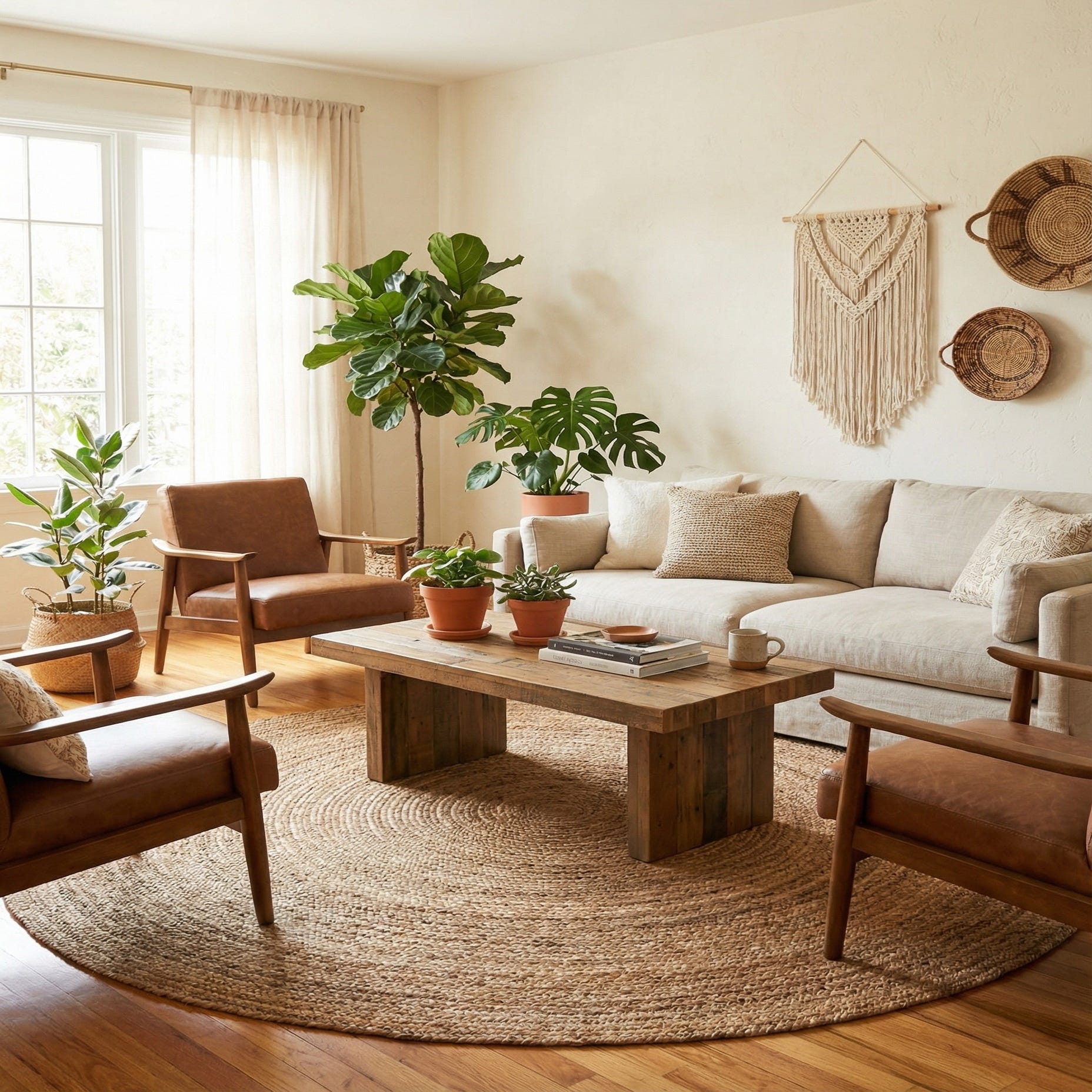 This rug works well as an anchor for casual dining setups beneath a round table, a relaxed seating area, or a bright sunroom layered over hardwood or tile. Its organic color and woven texture pair naturally with neutral palettes, coastal or farmhouse furnishings, and bohemian or modern-rustic interiors where tactile materials and earthy tones are preferred.