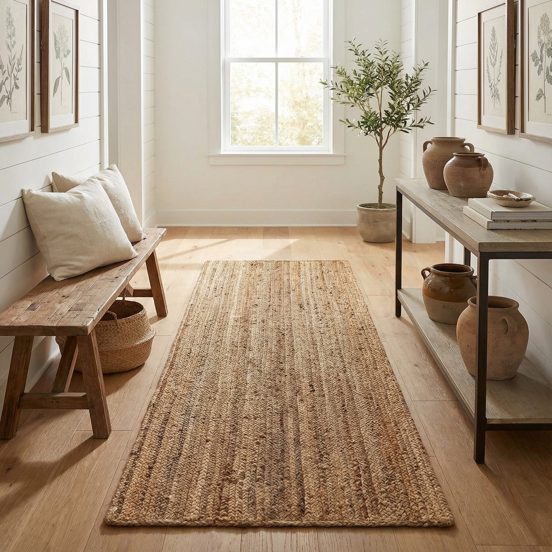 This runner works well in hallways, entryways, or alongside a kitchen island where a natural foundation is wanted. Pair it with light-stained wood, rattan or wicker accents and linen upholstery for a coastal or farmhouse look, or layer it under a slim console table in a modern rustic or Scandinavian-inspired hallway. It also complements bohemian settings when combined with mixed textiles and indoor plants, bringing a grounded, approachable element to a variety of interiors.