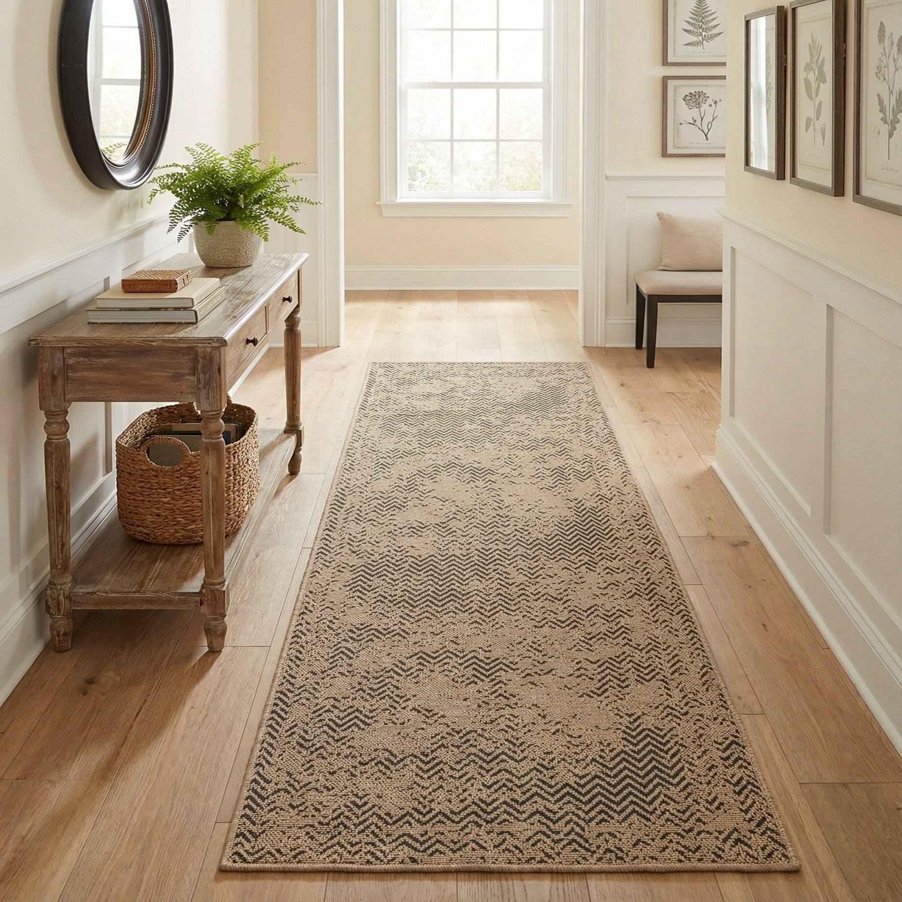The Dunes runner would complement a variety of home settings, fitting seamlessly into minimalist, contemporary, or coastal-inspired decor. The natural and brown palette and geometric pattern provide a touch of sophistication to hallways, entryways, or alongside kitchen cabinetry. It is well-suited for spaces that require a durable yet stylish floor covering.