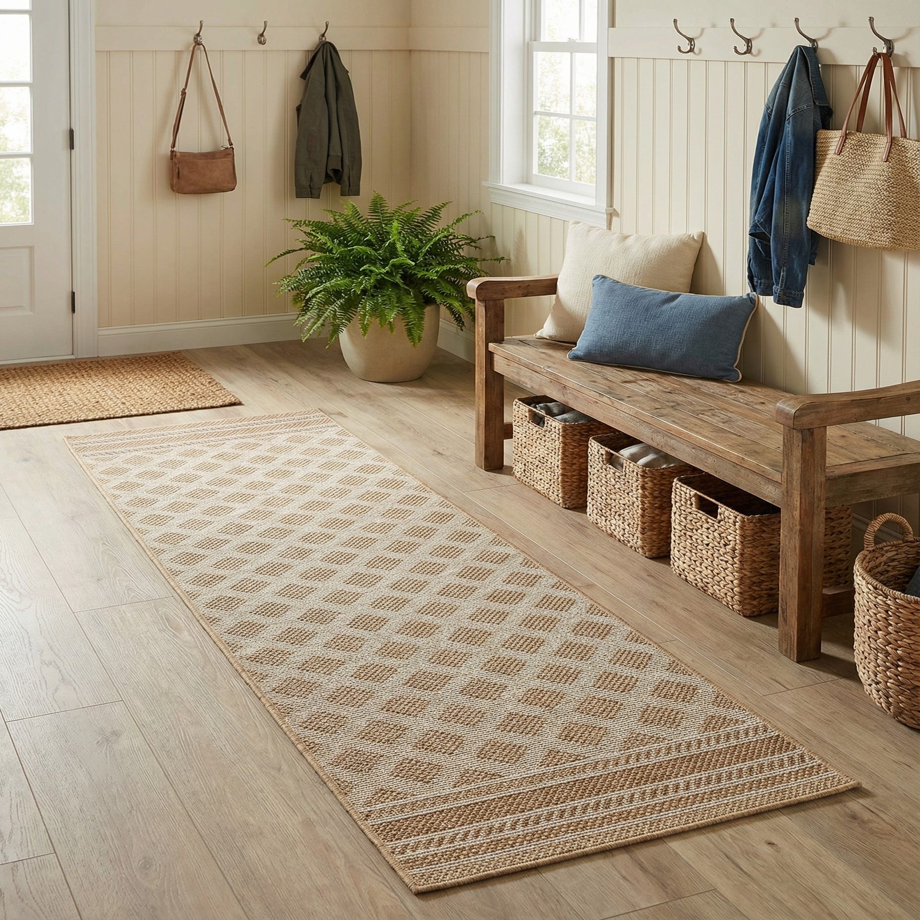 The color palette and classic design of this rug make it a versatile addition to a variety of decor themes. It can seamlessly integrate into minimalist, coastal, or contemporary settings, bringing a subtle, yet impactful enhancement to the chosen space. Due to its stain-resistant nature, this runner is particularly well-suited for outdoor patios, dining areas, or entryways where practicality and style are paramount.