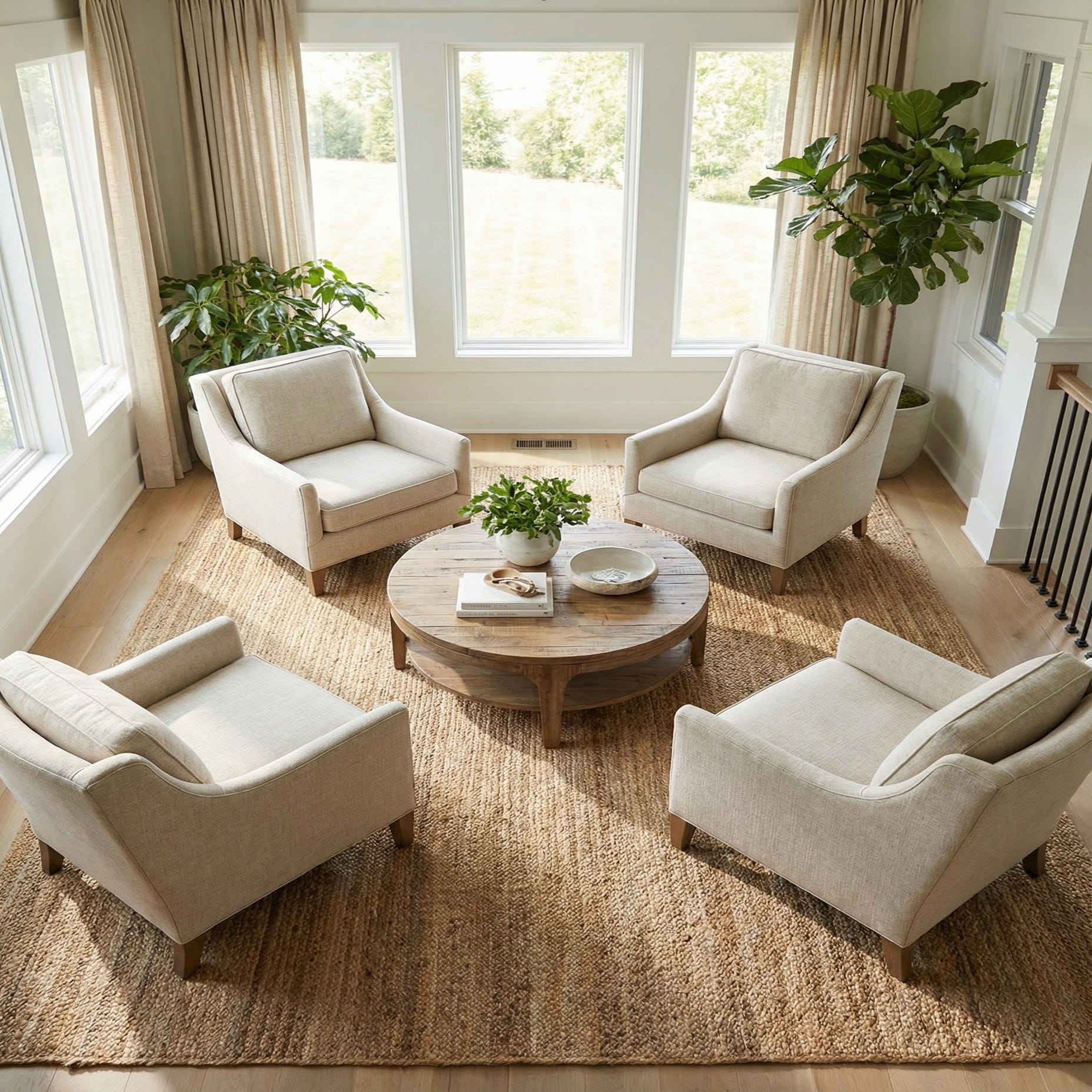 The square shape works well centered under a seating group or a square dining table, and its neutral palette pairs easily with coastal, farmhouse, bohemian or modern-minimal interiors. Use it to soften hardwood or tile floors in a living room, anchor a sunroom seating area, or layer a softer rug on top for contrast in a relaxed, layered look.