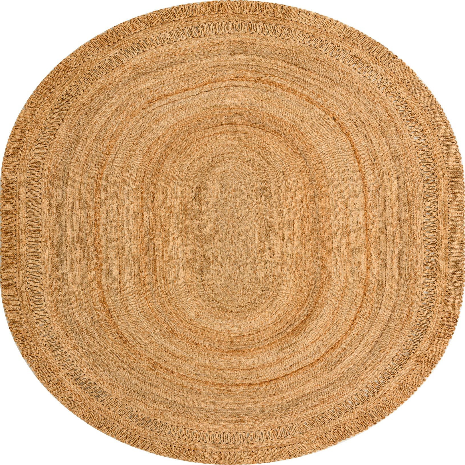 Hand braided of 100% jute, this oval rug displays concentric braided rings that create a clean, organic pattern. The Natural background offers warm, sandy tones with subtle color variation throughout the weave, and a looped braid along the edge provides a finished, handcrafted look. The overall style reads as relaxed and rustic with a timeless, understated presence.