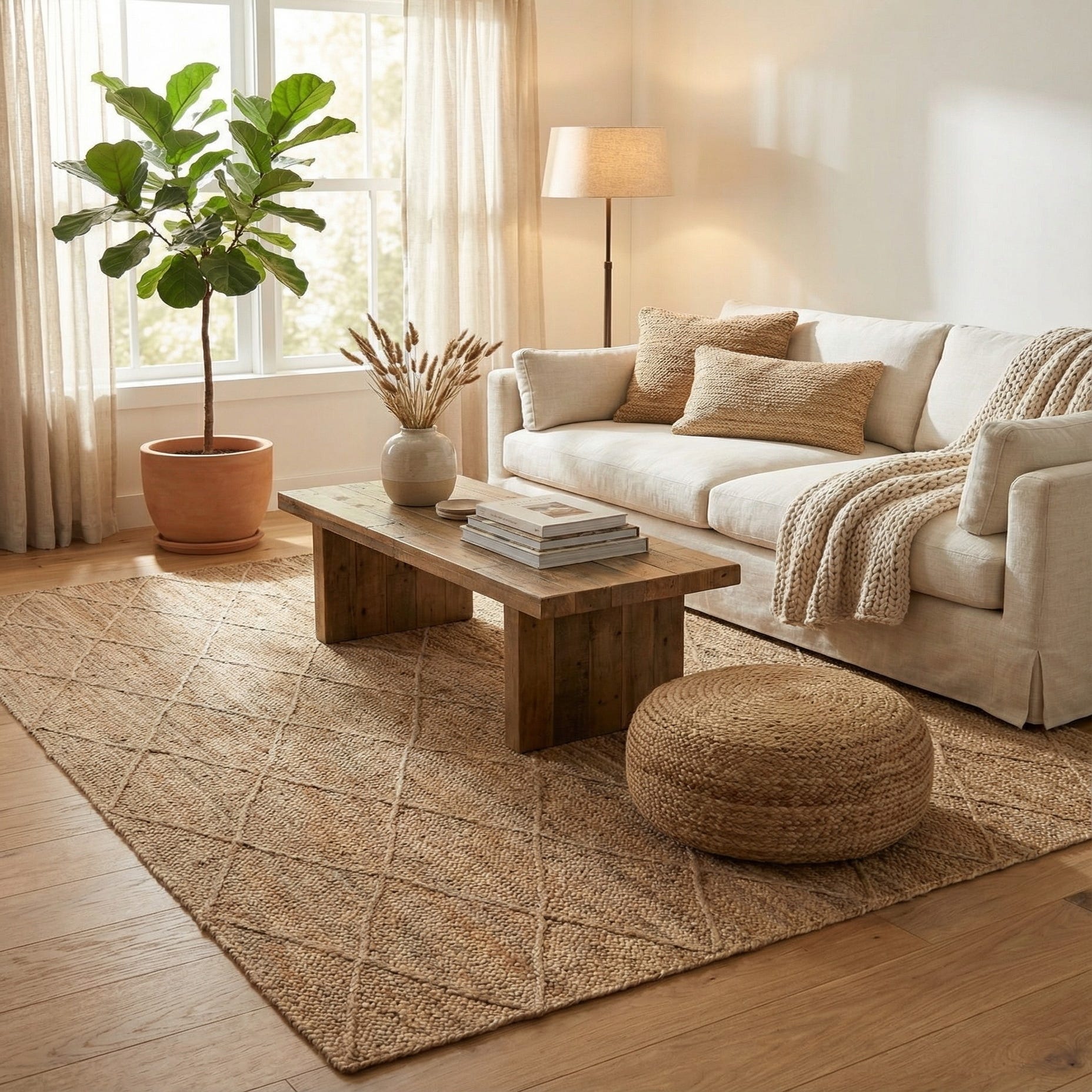An 8x11 rectangular natural jute rug with braided texture and a subtle diamond pattern, suitable for a living room.