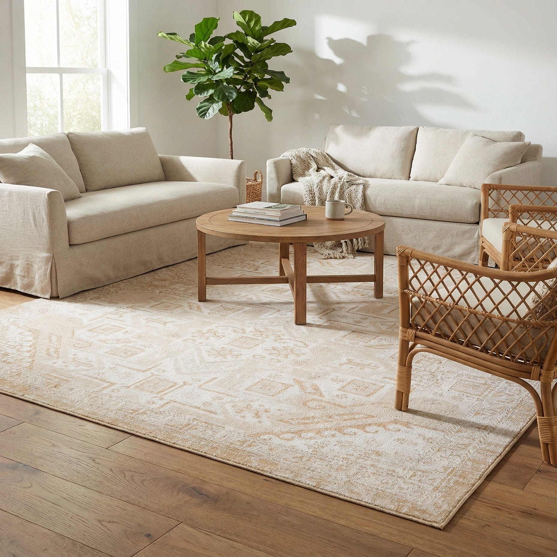 The warm, neutral palette integrates easily into a range of designs. Place it beneath a weathered-wood dining table or under a linen sofa to anchor a modern farmhouse or coastal living room, pair it with rattan seating and breezy textiles on a covered porch, or layer it with simple, black metal accents for a clean, contemporary look. Its understated pattern and tones make it a versatile choice for sunrooms, screened-in patios, or any space that benefits from a grounded, casual foundation.
