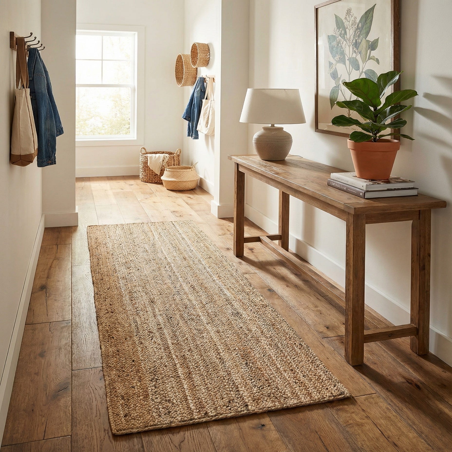 Warm, neutral tones and a simple braided motif make this rug well-suited to casual, coastal, Scandinavian, or farmhouse interiors. Place it in a hallway or entry to introduce texture and light, run it down a kitchen aisle to anchor the workspace, or lay it beside a bed to add natural warmth. It pairs naturally with light to medium wood flooring, rattan or wicker accents, and linen or cotton upholstery.